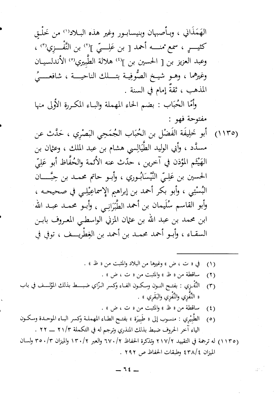 1135 - أَبُو خَليفَة الْفضل بن الْحباب الجُمَحِي الْبَصْرِيّ حدث عَن مُسَدّد وابي الْوَلِيد الطَّيَالِسِيّ هِشَام بن عبد الْملك وَعُثْمَان بن الْهَيْثَم الْمُؤَذّن فِي آخَرين حدث عَنهُ الْأَئِمَّة والحفاظ أَبُو عَليّ الْحُسَيْن بن عَليّ النَّيْسَابُورِي وَأَبُو حَاتِم مُحَمَّد بن حبَان البستي وَأَبُو بكر أَحْمد بن إِبْرَاهِيم الْإِسْمَاعِيلِيّ فِي صَحِيحَة وَأَبُو الْقَاسِم سُلَيْمَان بن أَحْمد الطَّبَرَانِيّ وَأَبُو مُحَمَّد عبد الله ابْن مُحَمَّد بن عبد الله بن عُثْمَان الْمُزنِيّ الوَاسِطِيّ الْمَعْرُوف بِابْن السقاء وَأَبُو أَحْمد مُحَمَّد بن أَحْمد بن الغطريف توفّي فِي