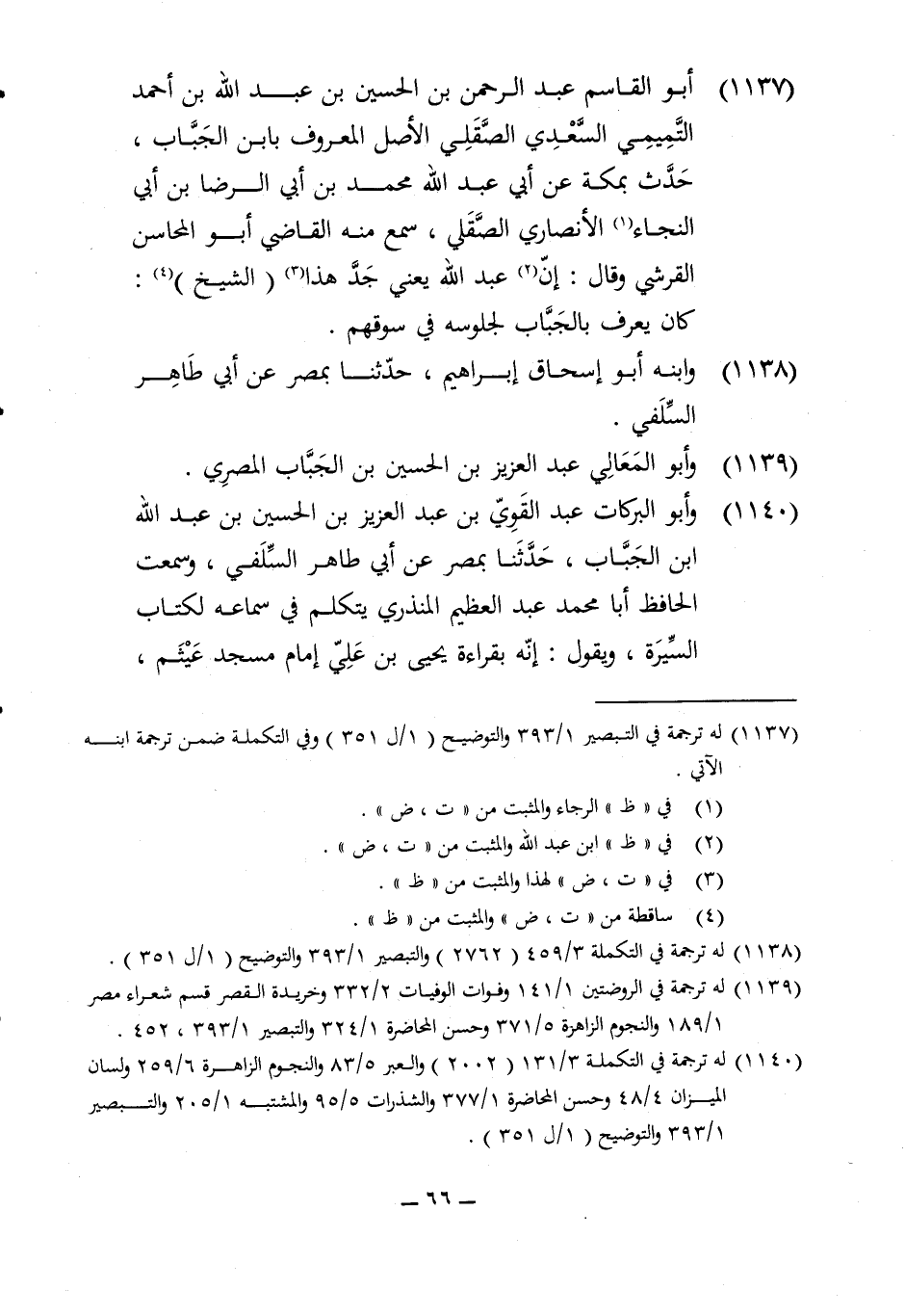 1137 - أَبُو الْقَاسِم عبد الرَّحْمَن بن الْحُسَيْن بن عبد الله بن أَحْمد التَّمِيمِي السَّعْدِيّ الصّقليّ الأَصْل الْمَعْرُوف بِابْن الْجبَاب حدث بِمَكَّة عَن أبي عبد الله مُحَمَّد بن أبي الرِّضَا بن أبي النَّجَاء الْأنْصَارِيّ الصّقليّ سمع مِنْهُ القَاضِي أَبُو المحاسن الْقرشِي وَقَالَ إِن عبد الله يَعْنِي جد هَذَا الشَّيْخ كَانَ يعرف بالجباب لجلوسه فِي سوقهم