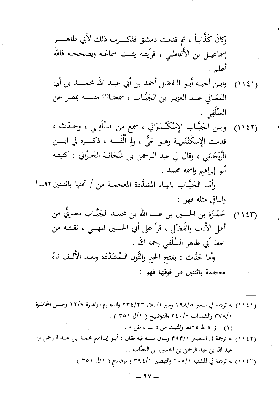 1142 - وَابْن الْجبَاب الإسْكَنْدراني سمع من السلَفِي وَحدث قدمت الْإسْكَنْدَريَّة وَهُوَ حَيّ وَلم القه ذكره لي ابْن الريحاني وَقَالَ لي عبد الرَّحْمَن بن شحانة الْحَرَّانِي كنيته أَبُو إِبْرَاهِيم واسْمه مُحَمَّد
