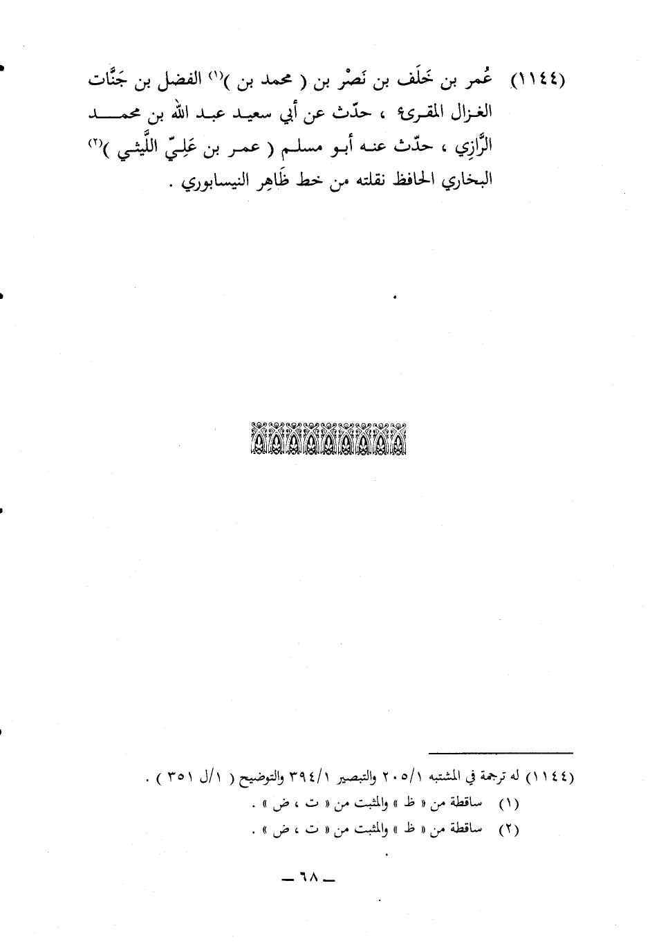 1144 - عمر بن خلف بن نصر بن مُحَمَّد بن الْفضل بن جنَّات الغزال المقرىء حدث عَن أبي سعيد عبد الله بن مُحَمَّد الرَّازِيّ حدث عَنهُ أَبُو مُسلم عمر بن عَليّ اللَّيْثِيّ البُخَارِيّ الْحَافِظ نقلته من خطّ ظَاهر النَّيْسَابُورِي