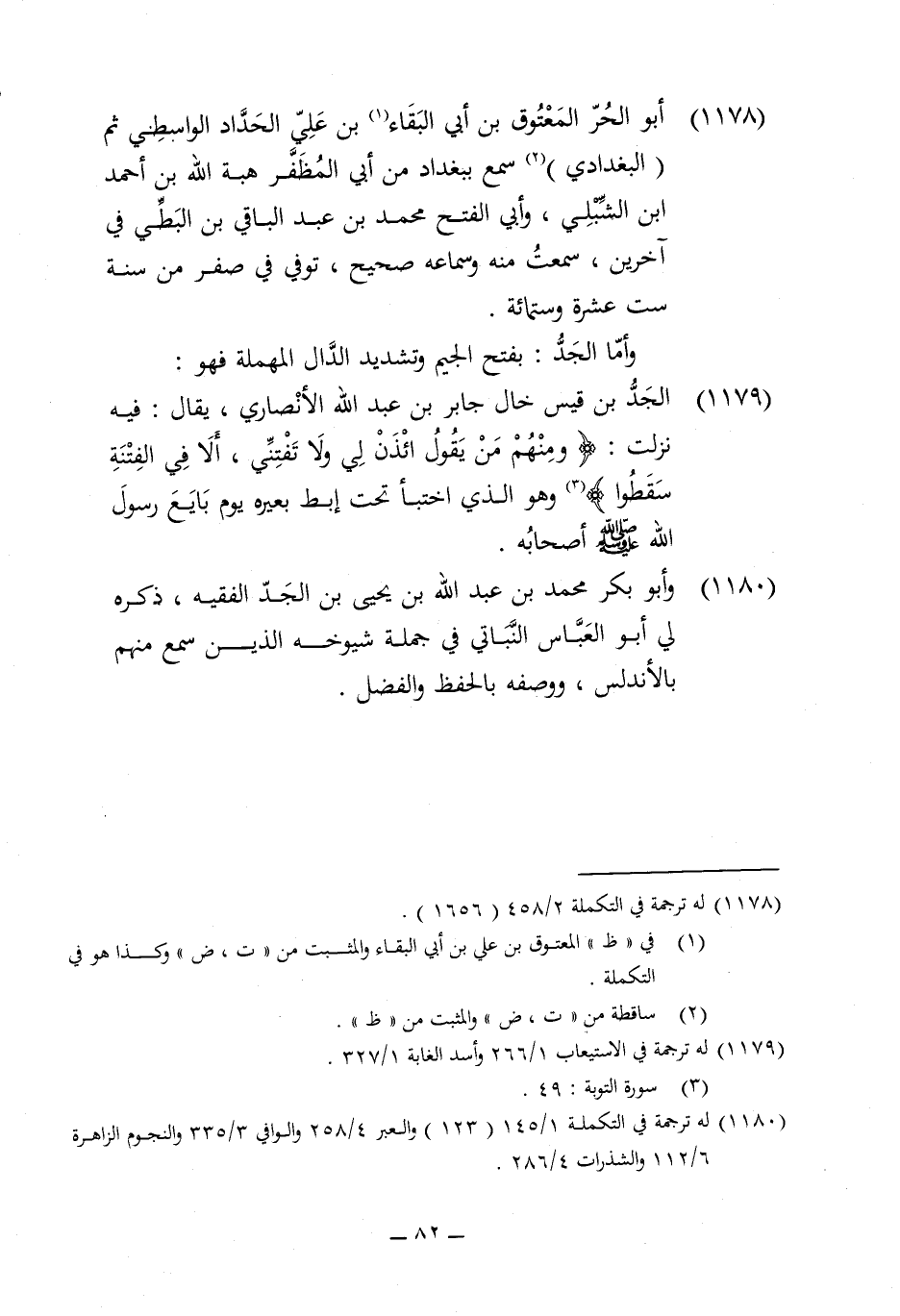 1179 - الْجد بن قيس خَال جَابر بن عبد الله الْأنْصَارِيّ يُقَال فِيهِ نزلت {وَمِنْهُم من يَقُول ائْذَنْ لي وَلَا تفتني أَلا فِي الْفِتْنَة سقطوا} وَهُوَ الَّذِي اخْتَبَأَ تَحت ابط بعيره يَوْم بَايع رَسُول الله صلى الله عَلَيْهِ وَسلم اصحابه
