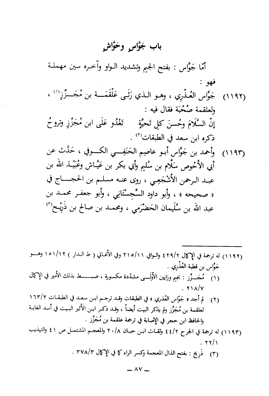 1193 - وَأحمد بن جواس أَبُو عَاصِم الْحَنَفِيّ الْكُوفِي حدث عَن أبي الْأَحْوَص سَلام بن سليم وَأبي بكر بن عَيَّاش وَعبيد الله بن عبد الرَّحْمَن الْأَشْجَعِيّ روى عَنهُ مُسلم بن الْحجَّاج فِي صَحِيحه وَأَبُو دَاوُد السجسْتانِي وابو جَعْفَر مُحَمَّد بن عبد الله بن سُلَيْمَان الْحَضْرَمِيّ وَمُحَمّد بن صَالح بن ذريح العكبري