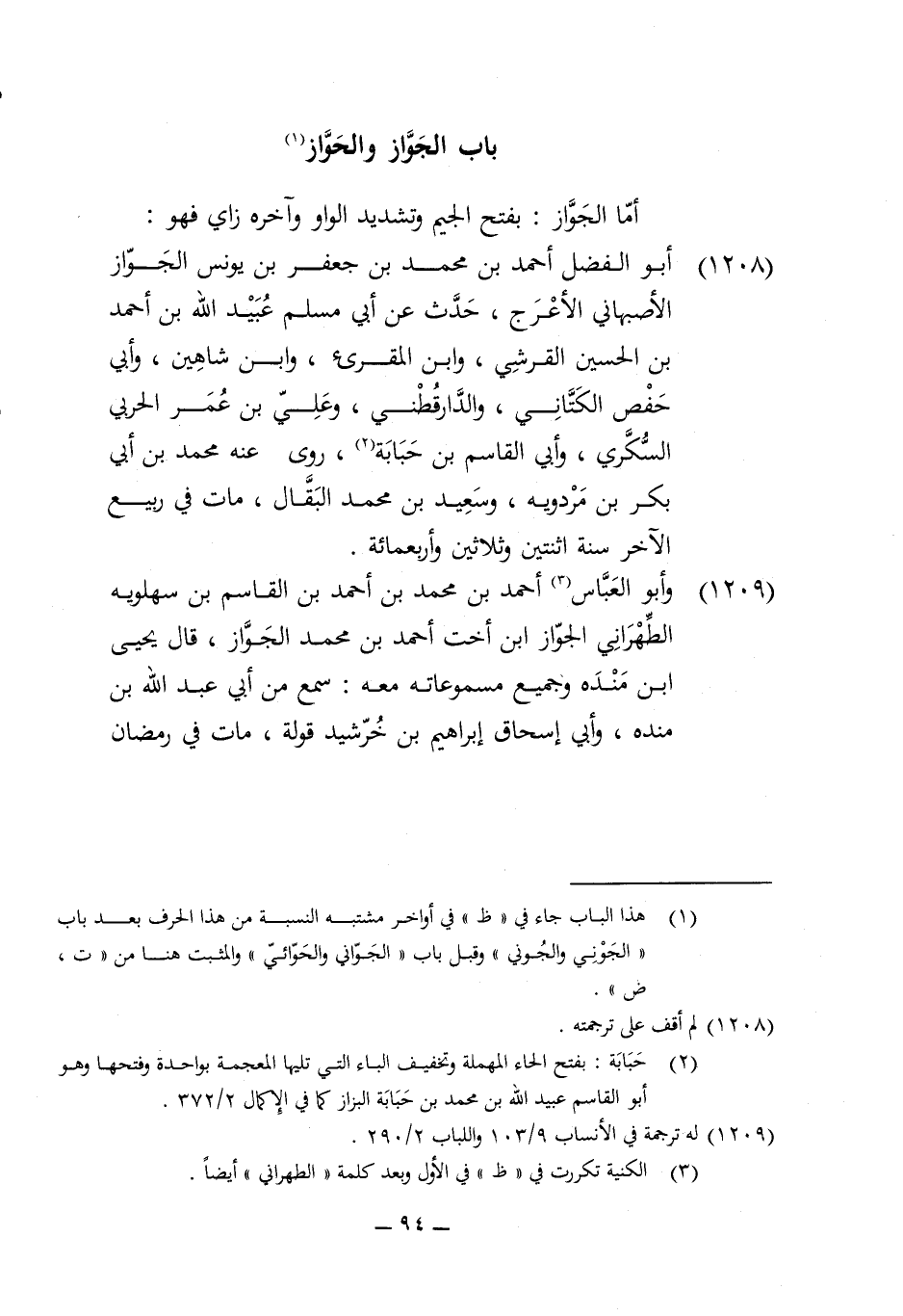 1208 - أَبُو الْفضل أَحْمد بن مُحَمَّد بن جَعْفَر بن يُونُس الْجَوَاز الْأَصْبَهَانِيّ الْأَعْرَج حدث عَن أبي مُسلم عبيد الله بن أَحْمد بن الْحُسَيْن الْقرشِي وَابْن المقرىء وَابْن شاهين وَأبي حَفْص الكتاني وَالدَّارَقُطْنِيّ وَعلي بن عمر الْحَرْبِيّ السكرِي وَأبي الْقَاسِم بن حبابة روى عَنهُ مُحَمَّد بن أبي بكر بن مرْدَوَيْه وَسَعِيد بن مُحَمَّد الْبَقَّال مَاتَ فِي ربيع الآخر سنة اثْنَتَيْنِ وَثَلَاثِينَ وَأَرْبَعمِائَة