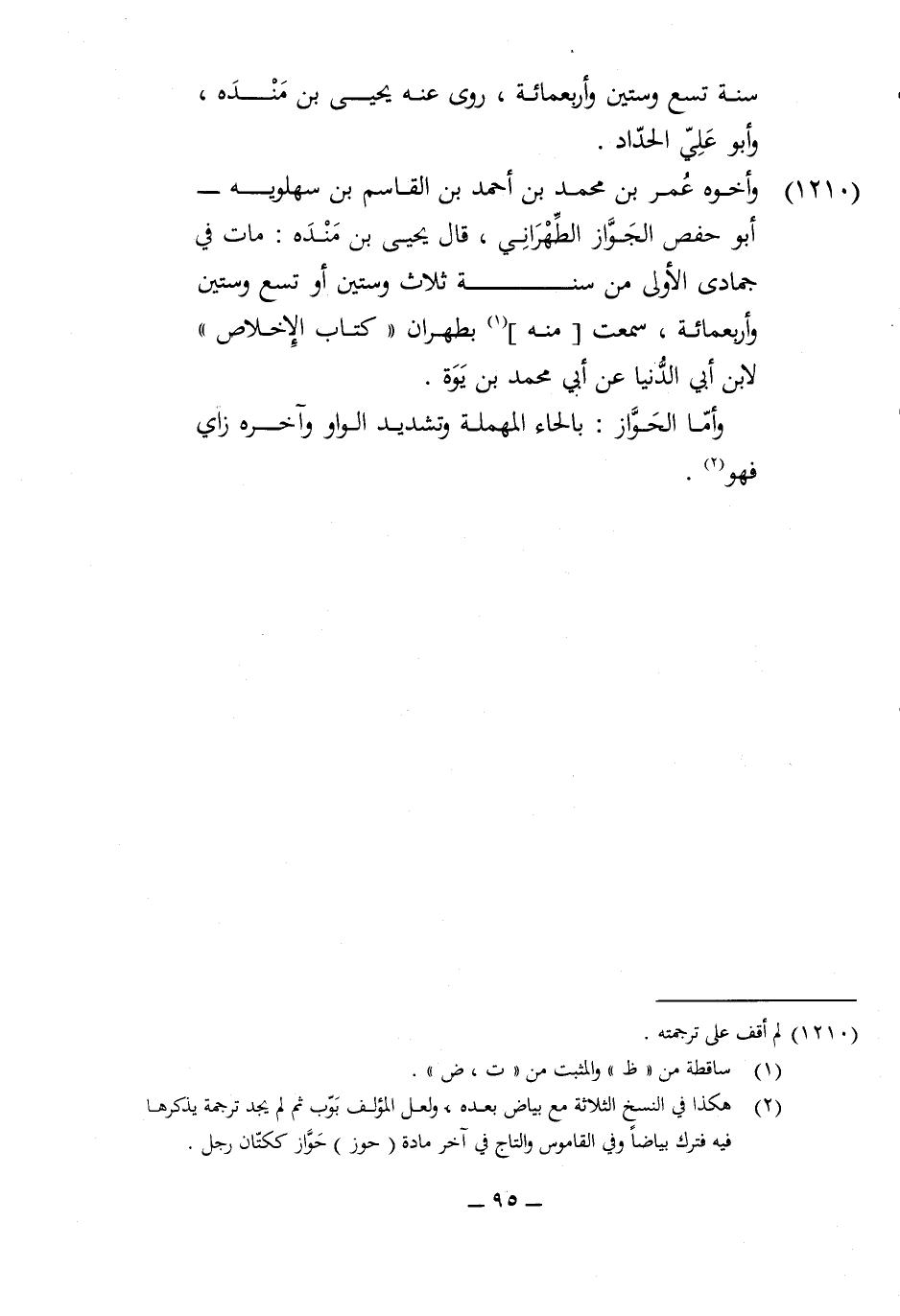 1210 - وَأَخُوهُ عمر بن مُحَمَّد بن أَحْمد بن الْقَاسِم بن سهلويه أَبُو حَفْص الْجَوَاز الطهراني قَالَ يحيى بن مَنْدَه مَاتَ فِي جُمَادَى الأولى من سنة ثَلَاث وَسِتِّينَ أَو تسع وَسِتِّينَ وَأَرْبَعمِائَة سَمِعت مِنْهُ بطهران كتاب الْإِخْلَاص لِابْنِ أبي الدُّنْيَا عَن أبي مُحَمَّد بن يوة