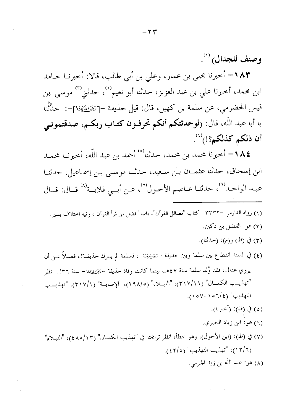183 - أَخْبَرَنَا يَحْيَى بْنُ عَمَّارٍ وَعَلِيُّ بْنُ أَبِي طَالِبٍ قَالَا أَخْبَرَنَا حَامِدُ بْنُ مُحَمَّدِ أَخْبَرَنَا عَلِيُّ بْنُ عَبْدِ الْعَزِيزِ حَدَّثَنَا أَبُو نُعَيْمٍ حَدَّثَنِي مُوسَى بْنُ قَيْسٍ الْحَضْرَمِيُّ عَنْ سَلَمَةَ بْنِ كُهَيْلٍ قَالَ قِيلَ لِحُذَيْفَةَ رَضِيَ اللَّهُ عَنْهُ حَدِّثْنَا يَا أَبَا عَبْدِ اللَّهِ قَالَ لَوْ حَدَّثْتُكُمْ أَنَّكُمْ تُحَرِّفُونَ كِتَابَ رَبِّكُمْ صَدَقْتُمُونِي أَنَّ ذَلِكُمْ كَذَلِكُمْ