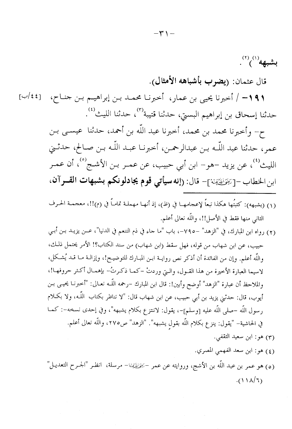 وأَخْبَرَنَا مُحَمَّدُ بْنُ مُحَمَّدٍ أَخْبَرَنَا عَبْدُ اللَّهِ بْنُ أَحْمَدَ حَدَّثَنَا عِيسَى بْنُ عُمَرَ حَدَّثَنَا عَبْدُ اللَّهِ بْنُ عَبْدِ الرَّحْمَنِ أَخْبَرَنَا عَبْدُ اللَّهِ بْنُ صَالِحٍ حَدَّثَنِي اللَّيثُ عَنْ يَزِيدَ هُوَ ابْنُ أبي حبيب عَن عمر بْنِ الأَشَجِّ أَنَّ عُمَرَ بْنَ الْخَطَّابِ رَضِيَ اللَّهُ عَنْهُ قَالَ إِنَّهُ سَيَأْتِي قَوْمٌ يُجَادِلُونَكُمْ بِشُبُهَاتِ الْقُرْآنِ