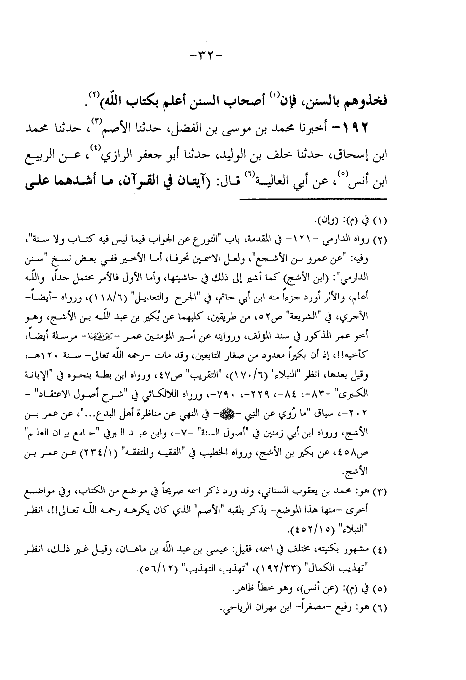 192 - أَخْبَرَنَا مُحَمَّدُ بْنُ مُوسَى بْنِ الْفَضْلِ حَدَّثَنَا الْأَصَمُّ حَدَّثَنَا مُحَمَّدُ بْنُ إِسْحَاقَ حَدَّثَنَا خَلَفُ بْنُ الْوَلِيدِ حَدَّثَنَا أَبُو جَعْفَرٍ الرَّازِيُّ عَنِ الرَّبِيعِ بْنِ أَنَسٍ عَنْ أَبِي الْعَالِيَةِ قَالَ آيَتَانِ فِي الْقُرْآنِ مَا أَشَدُّهُمَا عَلَى