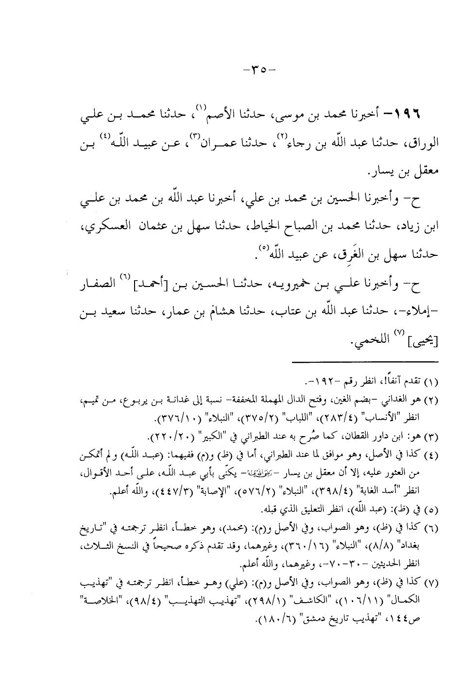 196 - أَخْبَرَنَا مُحَمَّدُ بْنُ مُوسَى حَدَّثَنَا الْأَصَمُّ حَدَّثَنَا مُحَمَّدُ بْنُ عَلِيٍّ الْوَرَّاقُ حَدَّثَنَا عَبْدُ اللَّهِ بْنُ رَجَاءٍ حَدَّثَنَا عِمْرَانُ عَنْ عُبَيْدِ اللَّهِ بن معقل بن يسَار
