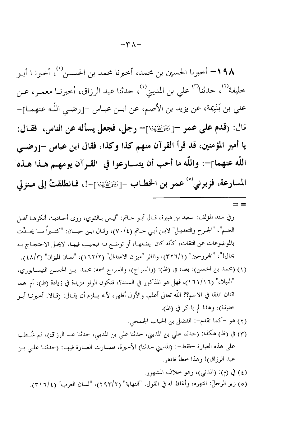 198 - أَخْبَرَنَا الْحُسَيْنُ بْنُ مُحَمَّدٍ أَخْبَرَنَا مُحَمَّدُ بْنُ الْحَسَنِ أَخْبَرَنَا أَبُو خَلِيفَةَ حَدَّثَنَا عَلِيُّ بْنُ الْمَدِينِيِّ حَدَّثَنَا عَبْدُ الرَّزَّاقِ أَخْبَرَنَا مَعْمَرٌ عَنِ عَلِيِّ بْنِ بَذِيمَةَ عَنْ يَزِيدَ بْنِ الَأصَمِّ عَنِ ابْنِ عَبَّاسٍ رَضِيَ اللَّهُ عَنْهُمَا قَالَ قَدِمَ عَلَى عُمَرَ رَضِيَ اللَّهُ عَنْهُ رَجُلٌ فَجَعَلَ يَسْأَلُهُ عَنِ النَّاسِ فَقَالَ يَا أَمِيرَ الْمُؤْمِنِينَ قَدْ قُرِأَ الْقُرْآنُ مِنْهُمْ كَذَا وَكَذَا فَقَالَ ابْنُ عَبَّاسٍ رَضِيَ اللَّهُ عَنْهُمَا وَاللَّهِ مَا أُحِبُّ أَنْ يَتَسَارَعُوا فِي الْقُرْآنِ يَوْمَهُمْ هَذَا هَذِهِ الْمُسَارَعَةِ فَزَبَرَنِي عُمَرُ بْنِ الْخَطَّابِ رَضِيَ اللَّهُ عَنْهُ فَانْطَلَقْتُ إِلَى مَنْزِلِي