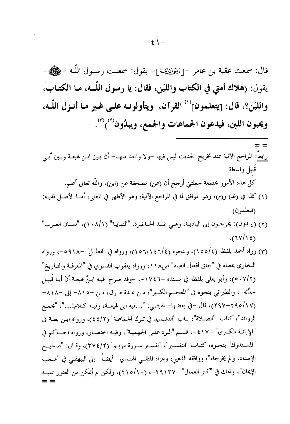 قَالَ سَمِعْتُ عُقْبَةَ بْنَ عَامِرٍ رَضِيَ اللَّهُ عَنْهُ يَقُولُ سَمِعْتُ رَسُولُ اللَّهِ صَلَّى اللَّهُ عَلَيْهِ وَسَلَّمَ يَقُولُ (هَلَاكُ أُمَّتِي فِي الْكِتَابِ وَاللَّبَنِ فَقَالَ يَا رَسُولَ اللَّهِ مَا الْكِتَابُ وَاللَّبَنُ قَالَ يَتَعَلَّمُونَ الْقُرْآنَ وَيَتَأَوَّلُونَهُ عَلَى غَيْرِ مَا أَنْزَلَ اللَّهُ وَيُحِبُّونَ اللَّبَنَ فَيدعونَ الْجَمَاعَات وَالْجمع ويبدون)