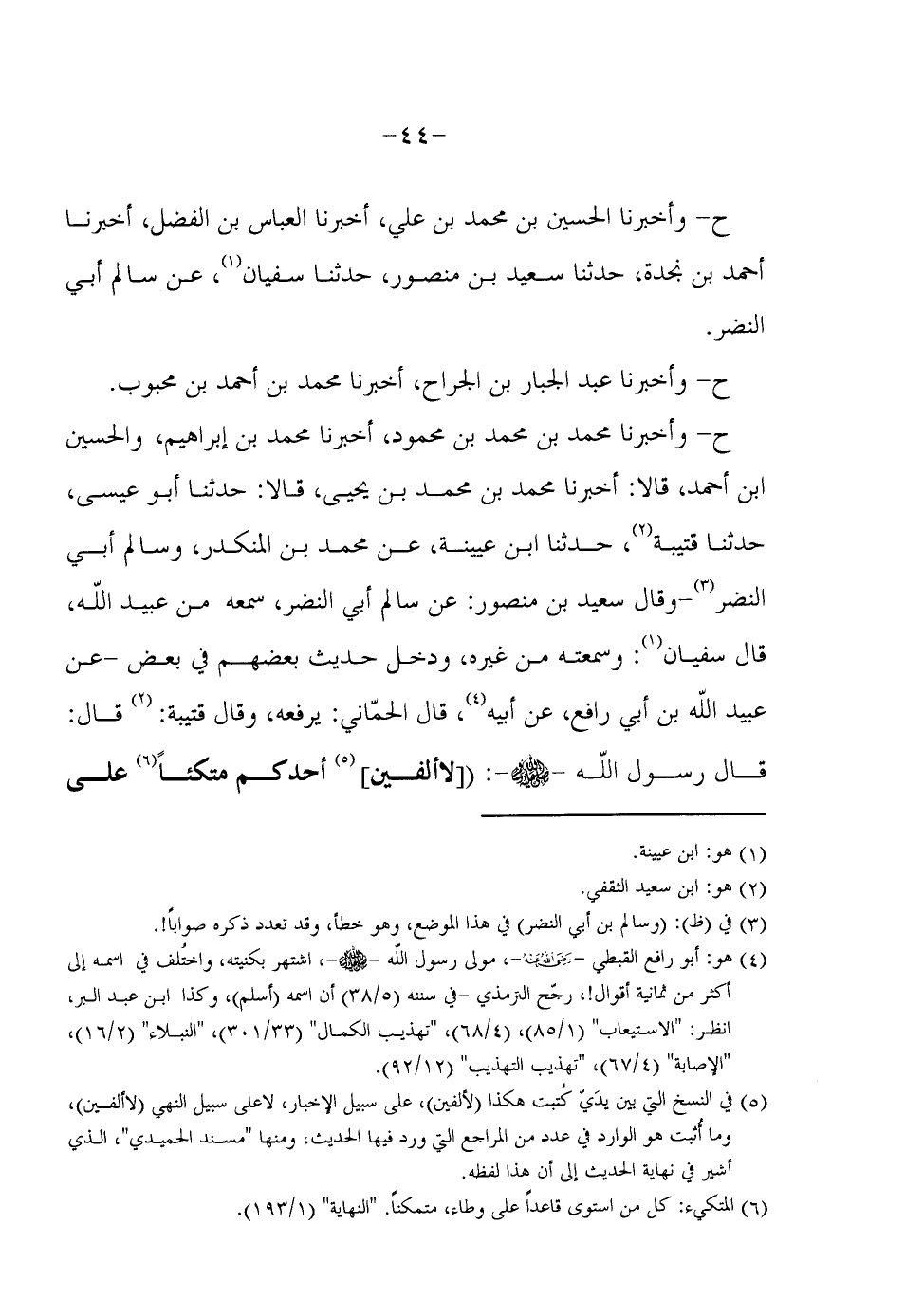 ح وَأَخْبَرَنَا مُحَمَّدُ بْنُ مُحَمَّدِ بْنِ مَحْمُودٍ أَخْبَرَنَا مُحَمَّدُ بْنُ إِبْرَاهِيمَ وَالْحُسَيْنُ بْنُ أَحْمَدَ قَالَا أَخْبَرَنَا مُحَمَّدُ بْنُ مُحَمَّدِ بْنِ يَحْيَى قَالَا حَدَّثَنَا أَبُو عِيسَى حَدَّثَنَا قُتَيْبَةَ حَدَّثَنَا ابْنُ عُيَيْنَةَ عَنْ مُحَمَّدِ بْنِ الْمُنْكَدِرِ وَسَالِمِ أَبِي النَّضْرِ وَقَالَ سَعِيدُ بْنُ مَنْصُورٍ عَنْ سَالِمِ أَبِي النَّضْر سَمِعَهُ مِنْ عُبَيْدِ اللَّهِ قَالَ سُفْيَانُ وَسَمِعْتُهُ مِنْ غَيْرِهِ وَدَخَلَ حَدِيثُ بَعْضِهِمْ فِي بَعْضٍ عَنْ عُبَيْدِ اللَّهِ بْنِ أَبِي رَافِعِ عَنْ أَبِيهِ قَالَ الْحَمَّانِيُّ يَرْفَعُهُ وَقَالَ قُتَيْبَةَ قَالَ قَالَ رَسُولُ اللَّهِ صَلَّى اللَّهُ عَلَيْهِ وَسَلَّمَ (لَا أَلْفِيَّنَ أَحَدَكُمْ مُتَكِئًا عَلَى