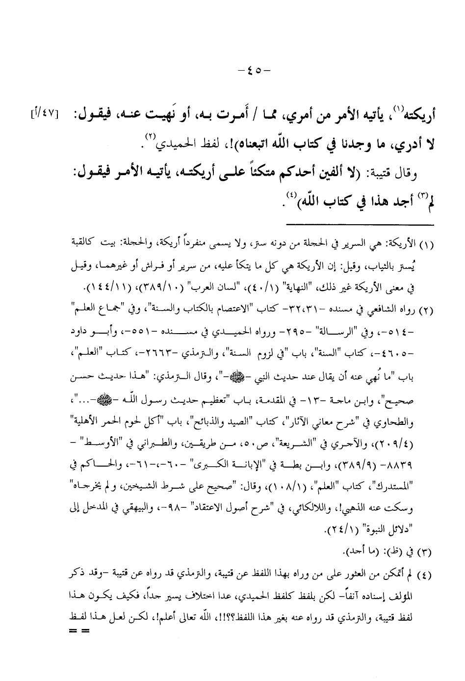 أَرِيكَتِهِ يَأْتِيهِ الَأَمْرُ مِنْ أَمْرِي مِمَّا أَمَرْتُ بِهِ أَوْ نَهَيْتُ عَنْهُ فَيَقُولُ لَا أَدْرِي مَا وَجَدْنَا فِي كِتَابِ اللَّهِ اتَّبَعْنَاهُ) لفظ الْحميدِي