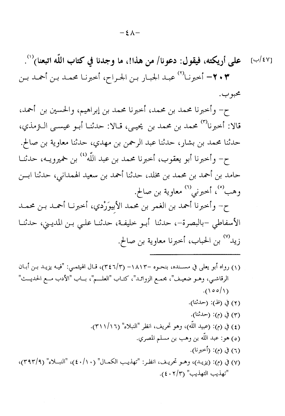 203 - أَخْبَرَنَا عَبْدُ الْجَبَّارِ بْنُ الْجَرَّاحِ أَخْبَرَنَا مُحَمَّدُ بْنُ أَحْمَدَ بْنِ مَحْبُوبٍ