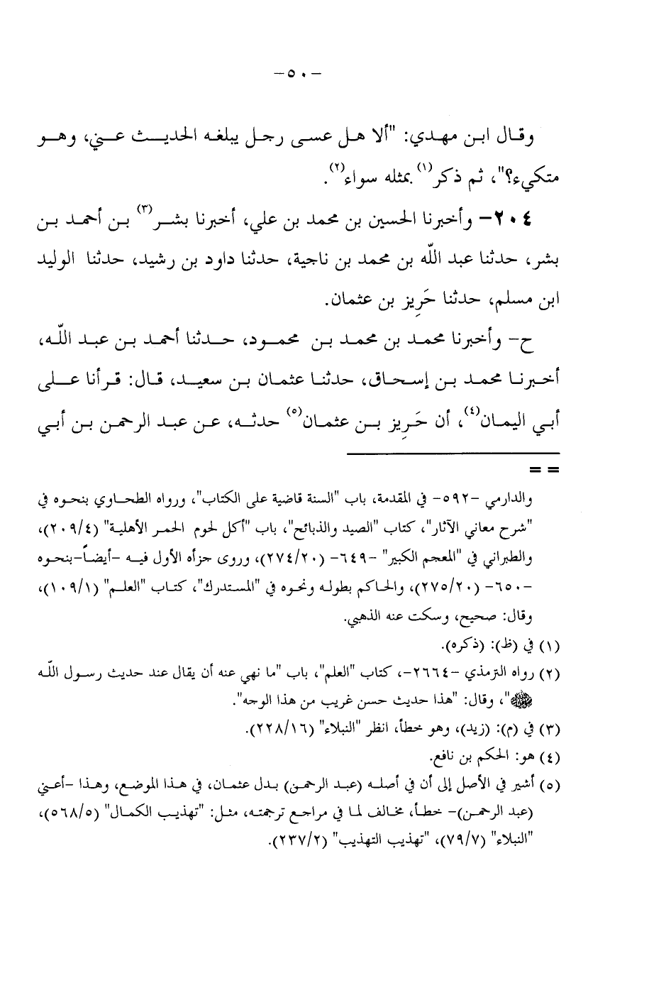 ح وَأَخْبَرَنَا مُحَمَّدُ بْنُ مُحَمَّدِ بْنِ مَحْمُودٍ حَدَّثَنَا أَحْمَدُ بْنُ عَبْدِ اللَّهِ أَخْبَرَنَا مُحَمَّدُ بْنُ إِسْحَاقَ حَدَّثَنَا عُثْمَانُ بْنُ سَعِيدٍ قَالَ قَرَأْنَا عَلَى أَبِي الْيَمَانِ أَنَّ حَرِيزَ بْنَ عُثْمَانَ حَدَّثَهُ عَنْ عَبْدِ الرَّحْمَنِ بْنِ أَبِي