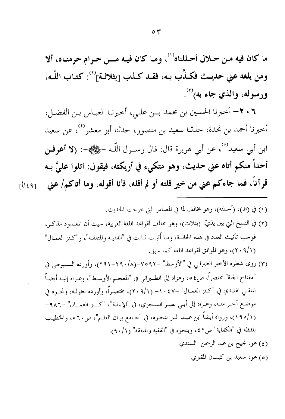 206 - أَخْبَرَنَا الْحُسَيْنُ بْنُ مُحَمَّدِ بْنِ عَلِيٍّ أَخْبَرَنَا الْعَبَّاسُ بْنُ الْفَضْلِ أَخْبَرَنَا أَحْمَدُ بْنُ نَجْدَةَ حَدَّثَنَا سَعِيدُ بْنُ مَنْصُورٍ حَدَّثَنَا أَبُو مَعْشَرٍ عَنْ سَعِيدِ بْنِ أَبِي سَعِيدٍ عَنْ أَبِي هُرَيْرَةَ قَالَ قَالَ رَسُولُ اللَّهِ صَلَّى اللَّهُ عَلَيْهِ وَسَلَّمَ (لَا أَعْرِفَنَّ أَحَدًا مِنْكُمْ أَتَاهُ عَنِّي حَدِيثٌ وَهُوَ مُتَكِئٌ فِي أَرِيكَتِهِ فَيَقُولُ اتْلُوا عَلَيَّ بِهِ قُرْآنًا فَمَا جَاءَكُمْ عَنِّي مِنْ خَيْرٍ قُلْتُهُ أَوْ لَمْ أَقُلْهُ فَأَنَا أَقُولُهُ وَمَا أَتَاكُمْ عَنِّي
