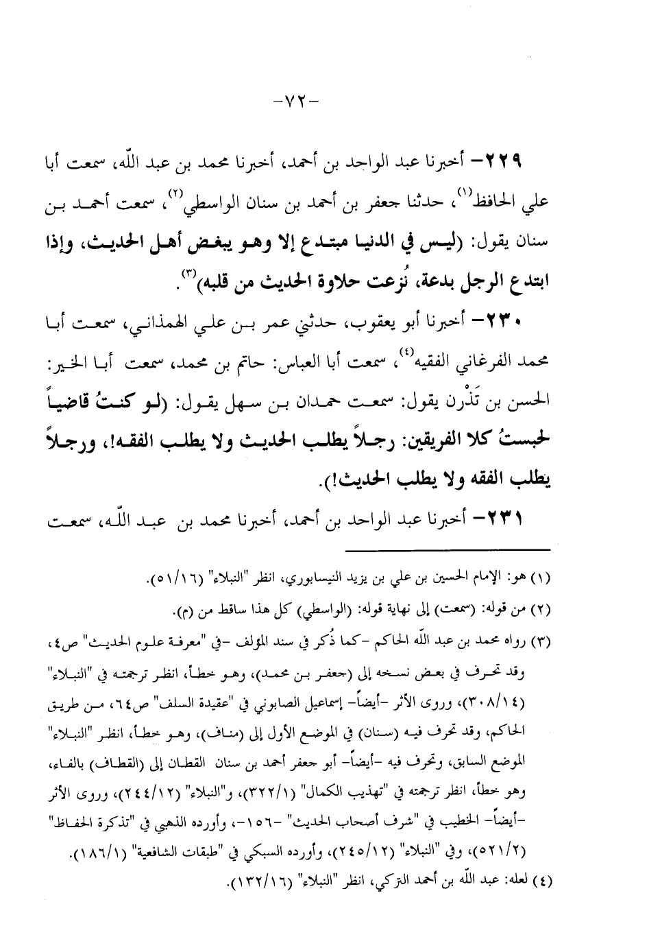 229 - أَخْبَرَنَا عَبْدُ الْوَاحِدِ بْنُ أَحْمَدَ أَخْبَرَنَا مُحَمَّدُ بْنُ عَبْدِ اللَّهِ سَمِعْتُ أَبَا عَلِيٍّ الْحَافِظَ حَدَّثَنَا جَعْفَرُ بْنُ أَحْمَدَ بْنِ سِنَانٍ الْوَاسِطِيُّ سَمِعْتُ أَحْمَدَ بْنَ سِنَانٍ يَقُولُ لَيْسَ فِي الدُّنْيَا مُبْتَدِعٌ إِلَا وَهُوَ يُبْغِضُ أَهْلَ الْحَدِيثِ وَإِذَا ابْتَدَعَ الرَّجُلُ بِدْعَةً نُزِعَتْ حَلَاوَةُ الْحَدِيثِ مِنْ قَلْبِهِ