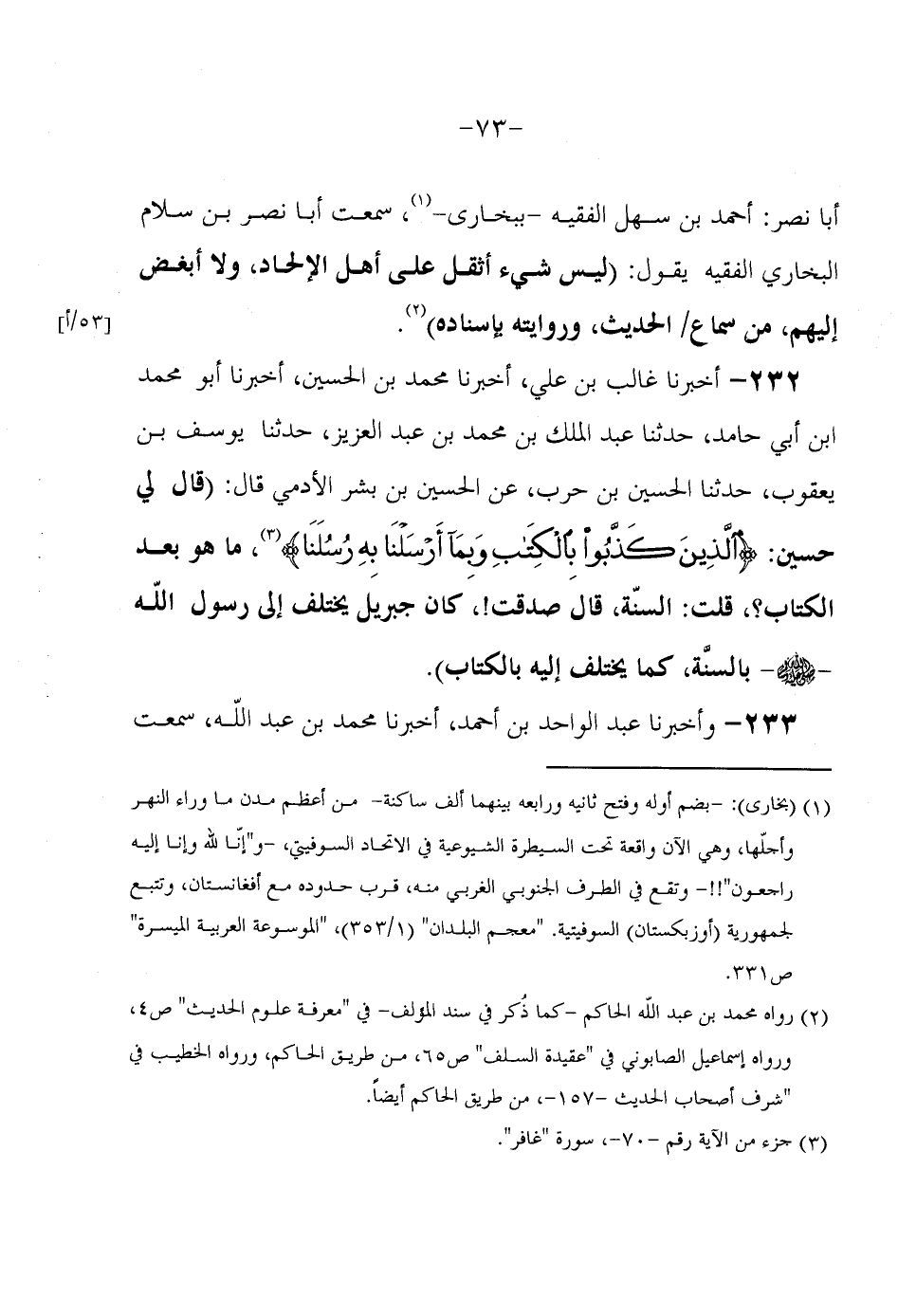 أَبَا نَصْرٍ أَحْمَدَ بْنَ سَهْلٍ الْفَقِيهَ بِبُخَارَى سَمِعْتُ أَبَا نَصْرِ بْنَ سَلَامٍ الْبُخَارِيَّ الْفَقِيهَ يَقُولُ لَيْسَ شَيْءٌ أَثْقَلَ عَلَى أَهْلِ الَإِلْحَادِ وَلَا أَبْغَضَ إِلَيْهِمْ مِنْ سَمَاعِ الْحَدِيثِ وَرِوَايَتِهِ بِإِسْنَادِهِ