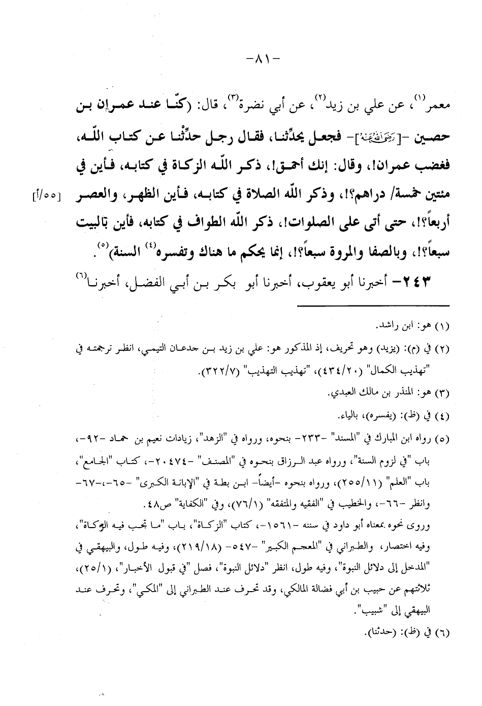مَعْمَرٍ عَنْ عَلِيِّ بْنِ زَيْدٍ عَنْ أَبِي نَضْرَةَ قَالَ كُنَّا عِنْدَ عِمْرَانَ بْنِ حُصَيْنٍ رَضِيَ اللَّهُ عَنْهُ فَجَعَلَ يُحَدِّثْنَا فَقَالَ رَجُلٌ حَدِّثْنَا عَنْ كِتَابِ اللَّهِ فَغَضِبَ عِمْرَانُ وَقَالَ إِنَّكَ أَحْمَقٌ ذَكَرَ اللَّهُ الزَّكَاةَ فِي كِتَابِهِ فَأَيْنَ فِي مئتين خَمْسَةُ دَرَاهِمَ وَذَكَرَ اللَّهُ الصَّلَاةَ فِي كِتَابِهِ فَأَيْنَ الْظُهْرُ وَالْعَصْرُ أَرْبَعًا حتَّى أَتَى عَلَى الصَّلَوَاتِ ذَكَرَ اللَّهُ الطَّوَافَ فِي كِتَابِهِ فَأَيْنَ بِالْبَيْتِ سَبْعًا وَبِالصَّفَا وَالْمَرْوَةِ سَبْعًا إِنَّمَا يَحْكُمُ مَا هُنَاكَ وَتُفَسِّرُهُ السُّنَّةُ
