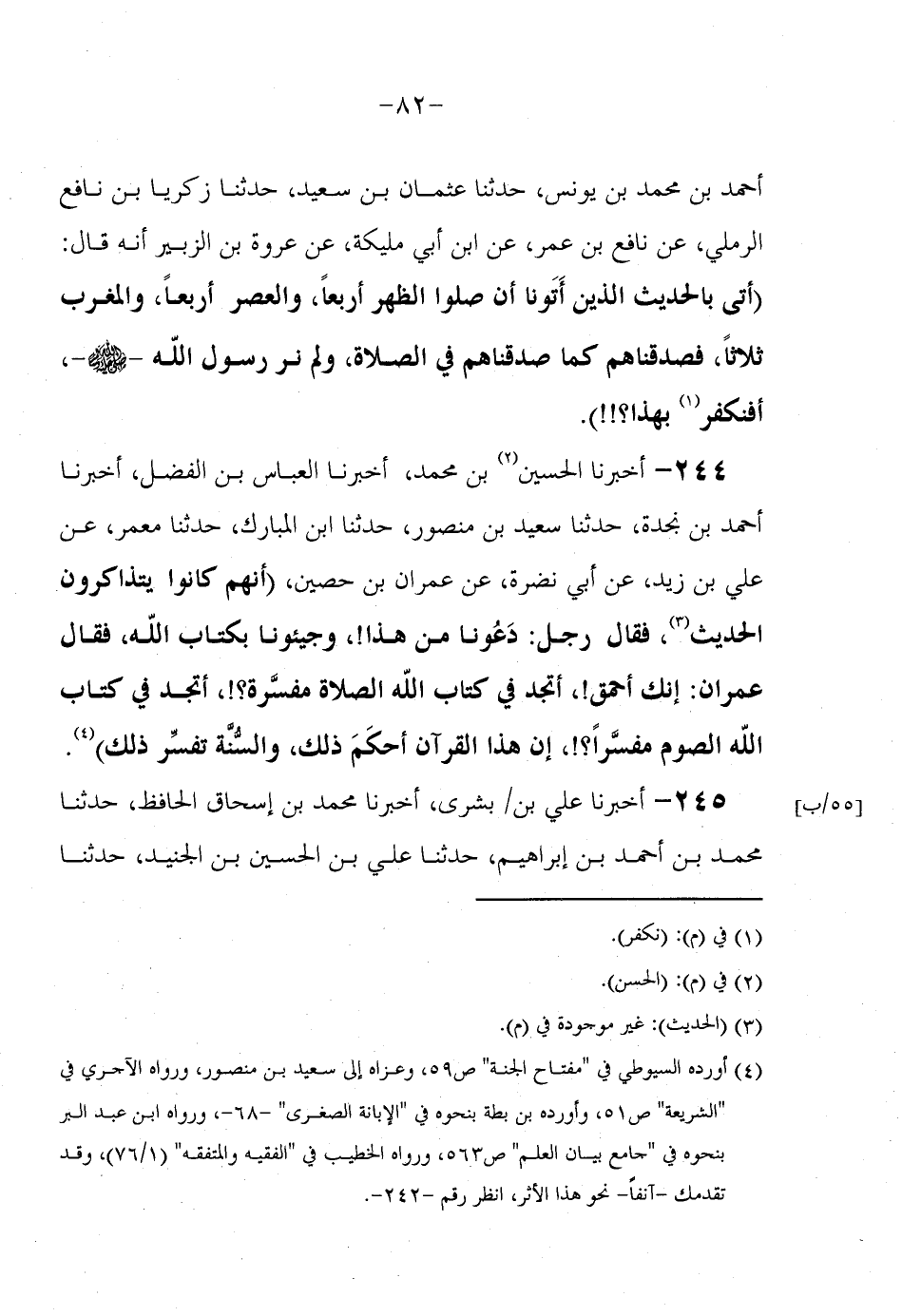 244 - أَخْبَرَنَا الْحُسَيْنُ بْنُ مُحَمَّدٍ أَخْبَرَنَا الْعَبَّاسُ بْنُ الْفَضْلِ أَخْبَرَنَا أَحْمَدُ بْنُ نَجْدَةَ حَدَّثَنَا سَعِيدُ بْنُ مَنْصُورٍ حَدَّثَنَا ابْنُ الْمُبَارَكِ حَدَّثَنَا مَعْمَرٌ عَنْ عَلِيِّ بْنِ زَيْدٍ عَنْ أَبِي نَضْرَةَ عَنْ عِمْرَانَ بْنِ حُصَيْنٍ أَنَّهُمْ كَانُوا يَتَذَاكَرُونَ الْحَدِيثَ فَقَالَ رَجُلٌ دَعُونَا مِنْ هَذَا وَجِيئُونَا بِكِتَابِ اللَّهِ فَقَالَ عِمْرَانُ إِنَّكَ أَحْمَقُ أَتَجِدُ فِي كِتَابِ اللَّهِ الصَّلَاةَ مُفَسَّرَةَ أَتَجِدُ فِي كِتَابِ اللَّهِ الصَّوْمَ مُفَسَّرًا إِنَّ هَذَا الْقُرْآنَ أَحْكَمَ ذَلِكَ وَالسُّنَّةُ تُفَسِّرُ ذَلِكَ