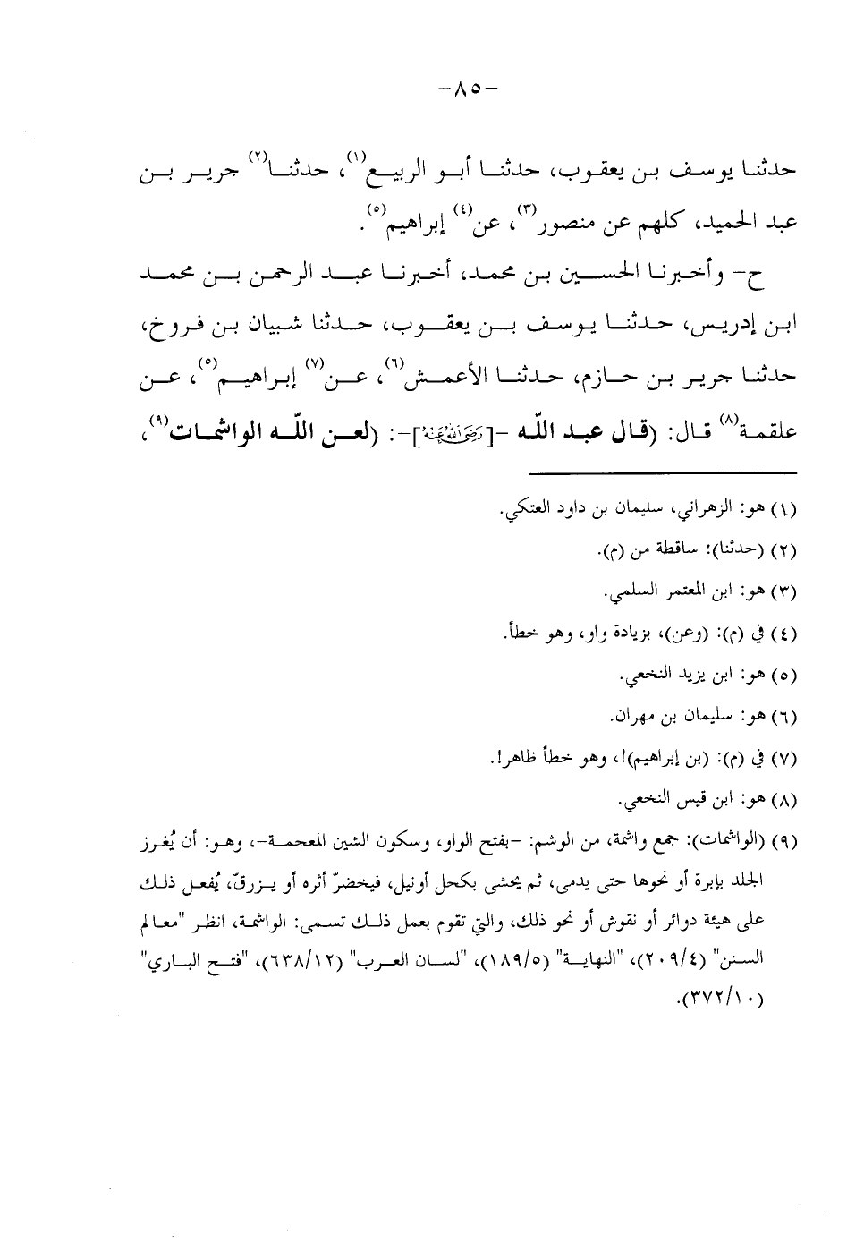 ح وَأَخْبَرَنَا الْحُسَيْنُ بْنُ مُحَمَّدٍ أَخْبَرَنَا عَبْدُ الرَّحْمَنِ بْنُ مُحَمَّدِ بْنِ إِدْرِيسَ حَدَّثَنَا يُوسُف بن يَعْقُوب حَدثنَا شبيان بْنُ فَرُّوخٍ حَدَّثَنَا جَرِيرُ بْنُ حَازِمٍ حَدَّثَنَا الَأْعَمْشُ عَنْ إِبْرَاهِيمَ عَنْ عَلْقَمَةَ قَالَ قَالَ عَبْدُ اللَّهِ رَضِيَ اللَّهُ عَنْهُ لَعَنَ اللَّهُ الْوَاشِمَاتِ