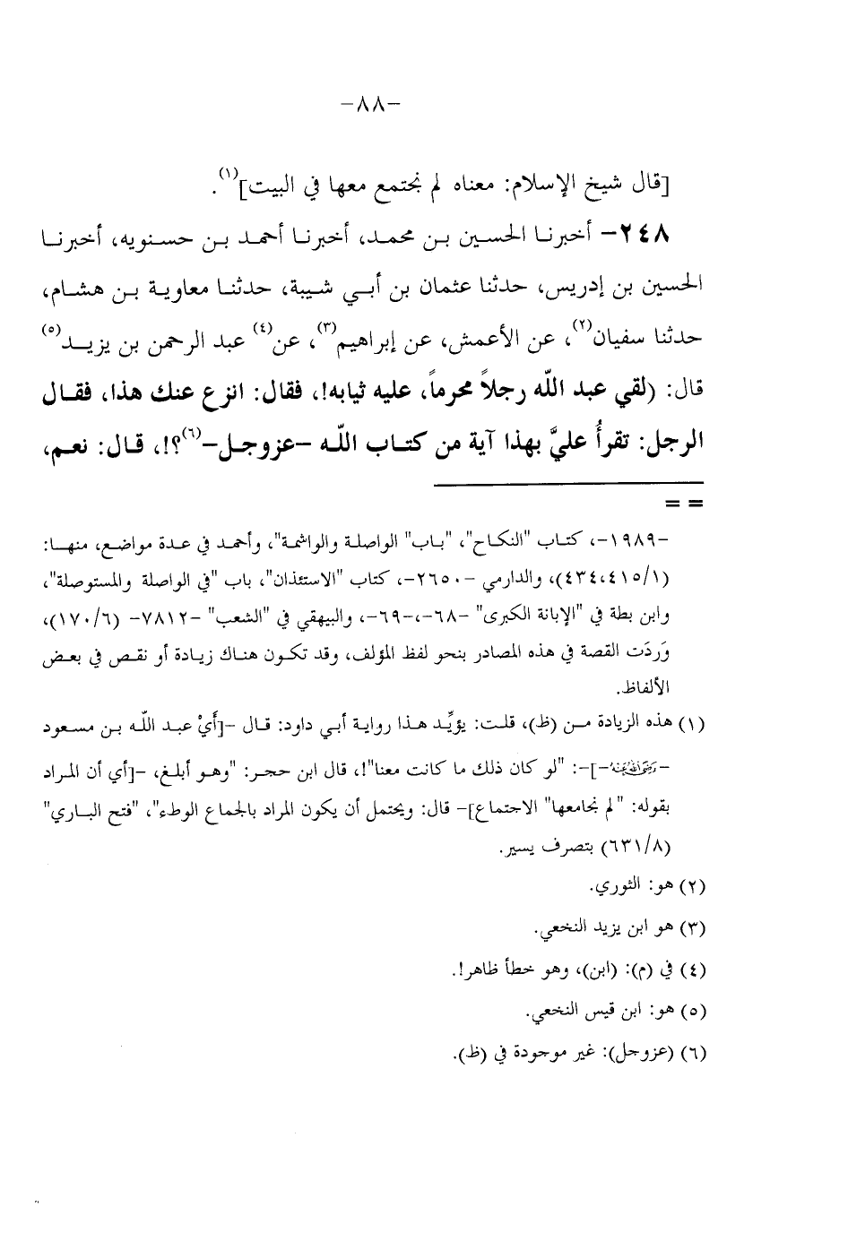 248 - أَخْبَرَنَا الْحُسَيْنُ بْنُ مُحَمَّدٍ أَخْبَرَنَا أَحْمَدُ بْنُ حَسْنَوَيْهِ أَخْبَرَنَا الْحُسَيْنُ بْنُ إِدْرِيسَ حَدَّثَنَا عُثْمَانُ بْنُ أَبِي شَيْبَةَ حَدَّثَنَا مُعَاوِيَةُ بْنُ هِشَامٍ حَدَّثَنَا سُفْيَانُ عَنِ الَأَعْمَشِ عَنِ إِبْرَاهِيمَ عَنْ عَبْدِ الرَّحْمَنِ بْنِ يَزِيدَ قَالَ لَقِيَ عَبْدُ اللَّهِ رَجُلَا مُحْرِمًا عَلَيْهِ ثِيَابُهُ فَقَالَ انْزَعْ عَنْكَ هَذَا فقَالَ الرَّجُلُ تَقْرَأُ عَلِيَّ بِهَذَا آيَةً مِنْ كِتَابِ اللَّهِ عَزَّ وَجَلَّ قَالَ نَعَمْ