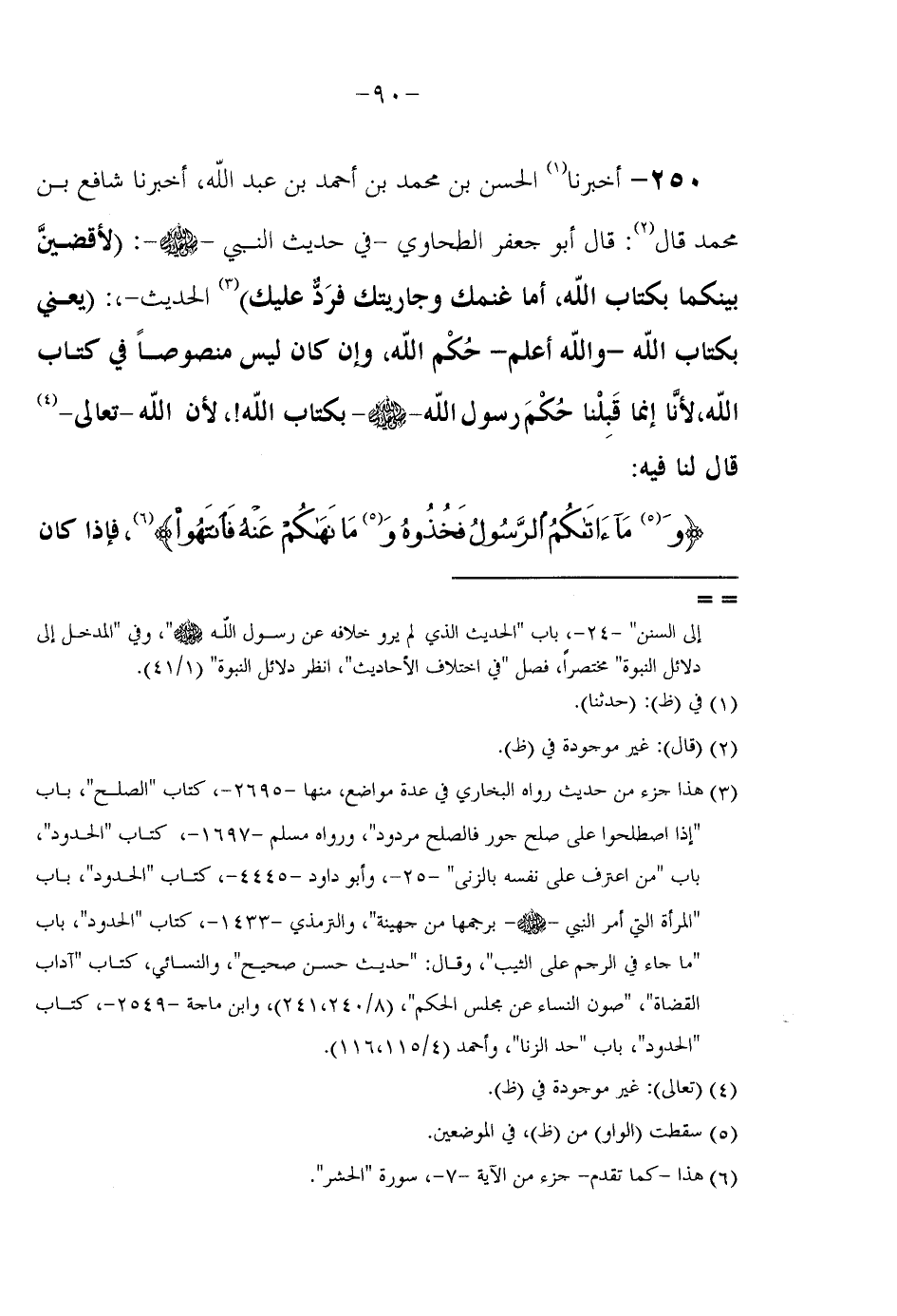 250 - أَخْبَرَنَا الْحَسَنُ بْنُ مُحَمَّدِ بْنِ أَحْمَدُ بْنُ عَبْدِ اللَّهِ أَخْبَرَنَا شَافِعُ بْنُ مُحَمَّدٍ قَالَ قَالَ أَبُو جَعْفَرٍ الطَّحَاوِيُّ فِي حَدِيثِ النَّبِيِّ صَلَّى اللَّهُ عَلَيْهِ وَسَلَّمَ (لَأَقْضِيَنَّ بَيْنَكُمَا بِكِتَابِ اللَّهِ أَمَّا غَنَمُكَ وَجَارِيَتُكَ فَرَدٌّ عَلَيْكَ) الْحَدِيثُ يَعْنِي بِكِتَابِ اللَّهِ وَاللَّهُ أَعْلَمُ حُكْمَ اللَّهِ وَإِنْ كَانَ لَيْسَ مَنْصُوصًا فِي كِتَابِ اللَّهِ لَأنَّا إِنَّمَا قَبِلْنَا حُكْمَ رَسُولِ اللَّهِ صَلَّى اللَّهُ عَلَيْهِ وَسَلَّمَ بِكِتَابِ اللَّهِ لَأَنَّ اللَّهَ تَعَالَى قَالَ لَنَا فِيهِ
