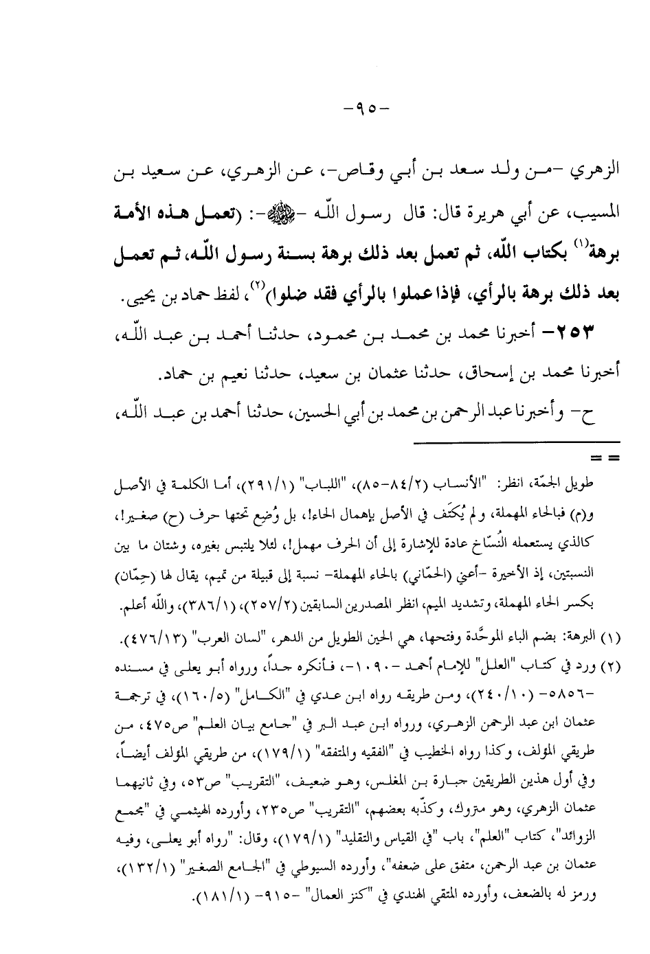 الزُّهْرِيُّ مِنْ وَلَدِ سَعْدِ بْنِ أَبِي وَقَّاصٍ عَنِ الزُّهْرِيِّ عَنْ سَعِيدِ بْنِ الْمُسَيِّبِ عَنْ أَبِي هُرَيْرَةَ قَالَ قَالَ رَسُولُ اللَّهِ صَلَّى اللَّهُ عَلَيْهِ وَسَلَّمَ (تَعْمَلُ هَذِهِ الَأُمَّةُ بِرْهَةً بِكِتَابِ اللَّهِ ثُمَّ تَعْمَلُ بَعْدَ ذَلِكَ بُرْهَةً بِسُنَّةِ رَسُولِ اللَّهِ ثُمَّ تَعْمُلُ بَعْدَ ذَلِكَ بُرْهَةً بِالرَّأْيِ فَإِذَا عمِلُوا بِالرَّأْيِ فقد ضلوا) ورد فِي كتاب الْعِلَل للْإِمَام أَحْمد فَأنكرهُ جدا وَرَوَاهُ أَبُو يعلى فِي مُسْنده لَفْظُ حَمَّادِ بْنِ يَحْيَى