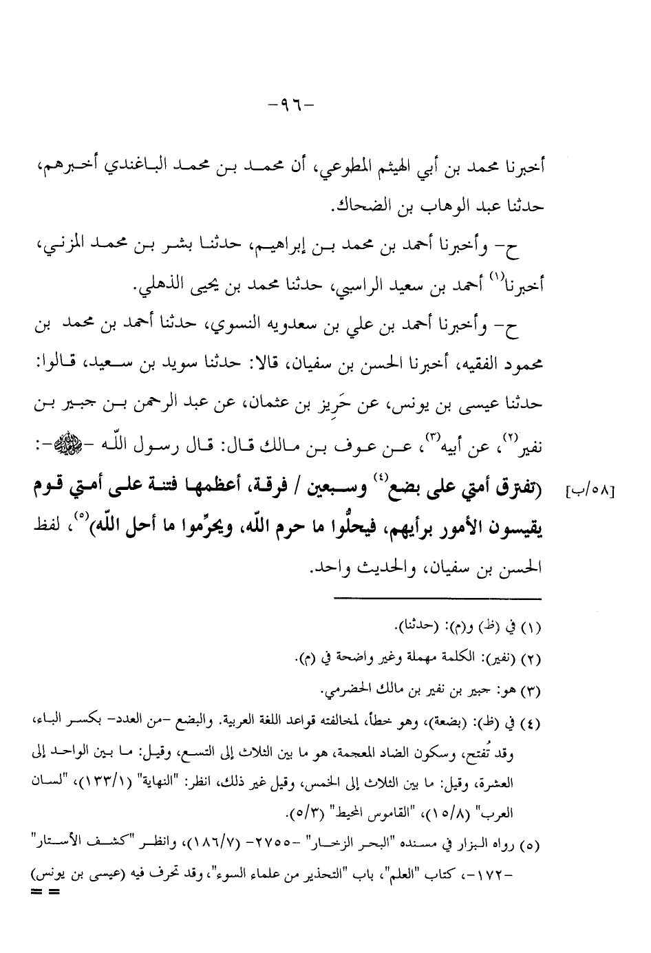 ح وَأَخْبَرَنَا أَحْمَدُ بْنُ عَلِيِّ بْنِ سَعْدَوَيْهِ النَّسَوِيُّ حَدَّثَنَا أَحْمَدُ بْنُ مُحَمَّدِ بْنِ مَحْمُودِ الْفَقِيهُ أَخْبَرَنَا الْحَسَنُ بْنُ سُفْيَانَ قالَا حَدَّثَنَا سُوَيْدُ بْنُ سَعِيدٍ قَالُوا حَدَّثَنَا عِيسَى بْنُ يُونُسَ عَنْ حَرِيزِ بْنِ عُثْمَانَ عَنْ عَبْدِ الرَّحْمَنِ بْنِ جُبَيْرِ بْنِ نُفَيْرٍ عَنْ أَبِيهِ عَنْ عَوْفِ بْنِ مَالِكٍ قَالَ قَالَ رَسُولُ اللَّهِ صَلَّى اللَّهُ عَلَيْهِ وَسَلَّمَ (تَفْتَرِقُ أُمَّتِي عَلَى بِضْعٍ وَسَبْعِينَ فِرْقَةً أَعْظَمُهَا فِتْنَةً عَلَى أُمَّتِي قَوْمٌ يَقِيسُونَ الَأُمُورَ بِرَأْيِهِمْ فَيُحِلُّوا مَا حَرَّمَ اللَّهُ وَيُحَرِّمُوا مَا أَحَّلَ اللَّهُ) رَوَاهُ الْبَزَّار فِي مُسْنده الْبَحْر الزخار وَانْظُر كشف الأستار لَفْظُ الْحَسَنِ بْنِ سُفْيَانَ وَالْحَدِيثُ وَاحِدٌ