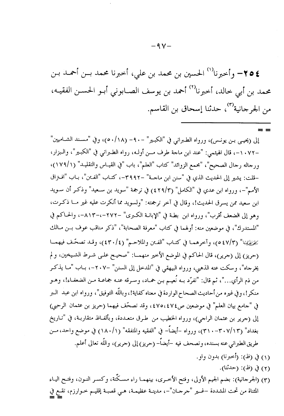 - وَأَخْبَرَنَا الْحُسَيْنُ بْنُ مُحَمَّدِ بْنِ عَلِيٍّ أَخْبَرَنَا مُحَمَّدُ بْنُ أَحْمَدَ بْنِ مُحَمَّدِ بْنِ أَبِي خَالِدٍ أَخْبَرَنَا أَحْمَدُ بْنُ يُوسُفَ الصَّابُونِيُّ أَبُو الْحَسَنِ الْفَقِيهُ مِنَ الْجُرْجَانِيَّةِ حَدَّثَنَا إِسْحَاقُ بْنُ الْقَاسِمِ