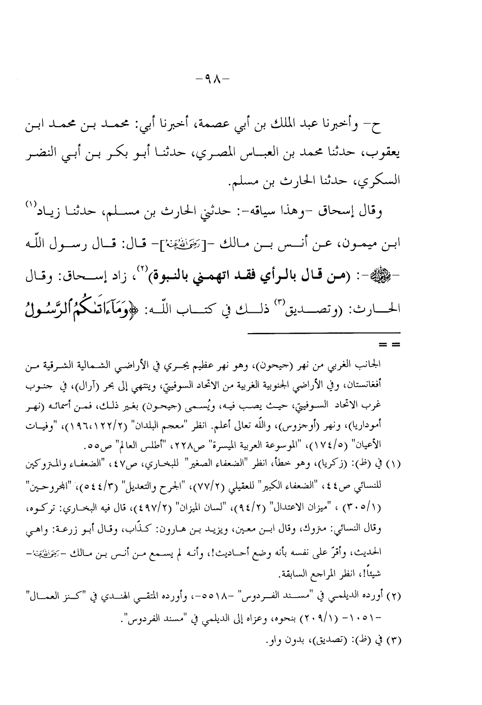 وَقَالَ إِسْحَاقُ وَهَذَا سِيَاقُهُ حَدَّثَنِي الْحَارِثُ بْنُ مُسْلِمٍ حَدَّثَنَا زِيَادُ بْنُ مَيْمُونٍ عَنْ أَنَسِ بْنِ مَالِكٍ رَضِيَ اللَّهُ عَنْهُ قَالَ قَالَ رَسُولُ اللَّهِ صَلَّى اللَّهُ عَلَيْهِ وَسَلَّمَ (مَنْ قَالَ بِالرَّأْيِ فقد اتهمني بِالنُّبُوَّةِ) أوردهُ الديلمي فِي مُسْند الفردوس وَأوردهُ المتقي الْهِنْدِيّ فِي كنز الْعمَّال زَادَ إِسْحَاقُ وَقَالَ الْحَارِثُ وَتَصْدِيقُ ذَلِكَ فِي كِتَابِ اللَّهِ {وَمَا آتَاكُم الرَّسُول}