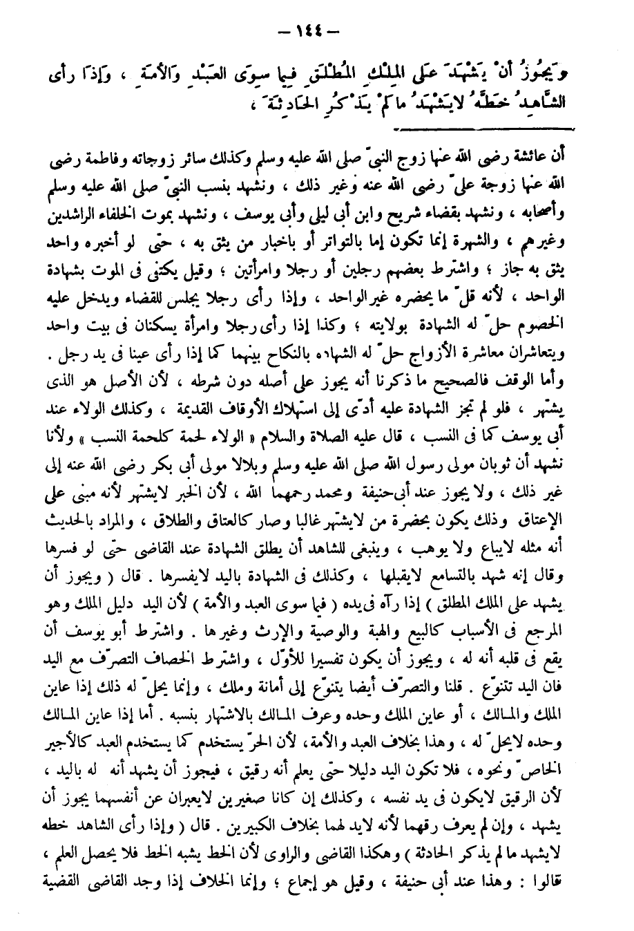 ـــــــــــــــــــــــــــــQأَنَّ عَائِشَةَ - رَضِيَ اللَّهُ عَنْهَا - زَوْجُ النَّبِيِّ - صَلَّى اللَّهُ عَلَيْهِ وَسَلَّمَ - وَكَذَلِكَ سَائِرُ زَوْجَاتِهِ وَفَاطِمَةُ - رَضِيَ اللَّهُ عَنْهَا - زَوْجَةُ عَلِيٍّ - رَضِيَ اللَّهُ عَنْهُ - وَغَيْرُ ذَلِكَ، وَنَشْهَدُ بِنَسَبِ النَّبِيِّ - صَلَّى اللَّهُ عَلَيْهِ وَسَلَّمَ - وَأَصْحَابِهِ، وَنَشْهَدُ بِقَضَاءِ شُرَيْحٍ وَابْنِ أَبِي لَيْلَى وَأَبِي يُوسُفَ، وَنَشْهَدُ بِمَوْتِ الْخُلَفَاءِ الرَّاشِدِينَ وَغَيْرِهِمْ، وَالشُّهْرَةُ إِنَّمَا تَكُونُ إِمَّا بِالتَّوَاتُرِ أَوْ بِإِخْبَارِ مَنْ يَثِقُ بِهِ، حَتَّى لَوْ أَخْبَرَهُ وَاحِدٌ يَثِقُ بِهِ جَازَ؛ وَاشْتَرَطَ بَعْضُهُمْ رَجُلَيْنِ أَوْ رَجُلًا وَامْرَأَتَيْنِ؛ وَقِيلَ يَكْتَفِي فِي الْمَوْتِ بِشَهَادَةِ الْوَاحِدِ؛ لِأَنَّهُ قَلَّ مَا يَحْضُرُهُ غَيْرُ الْوَاحِدِ، وَإِذَا رَأَى رَجُلًا يَجْلِسُ لِلْقَضَاءِ وَيَدْخُلُ عَلَيْهِ الْخُصُومُ حَلَّ لَهُ الشَّهَادَةُ بِوِلَايَتِهِ؛ وَكَذَا إِذَا رَأَى رَجُلًا وَامْرَأَةً يَسْكُنَانِ فِي بَيْتٍ وَاحِدٍ وَيَتَعَاشَرَانِ مُعَاشَرَةَ الْأَزْوَاجِ حَلَّ لَهُ الشَّهَادَةُ بِالنِّكَاحِ بَيْنَهُمَا كَمَا إِذَا رَأَى عَيْنًا فِي يَدِ رَجُلٍ.