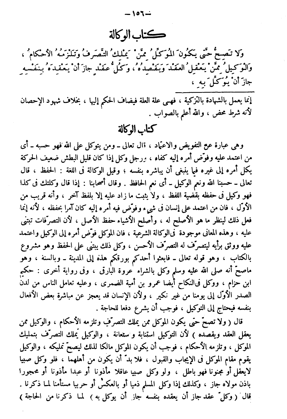 كِتَابُ الْوَكَالَةِ وَلَا تَصِحُّ حَتَّى يَكُونَ الْمُوَكِّلُ مِمَّنْ يَمْلِكُ التَّصَرُّفَ وَتَلْزَمُهُ الْأَحْكَامُ، وَالْوَكِيلُ مِمَّنْ يَعْقِلُ الْعَقْدَ وَيَقْصِدُهُ، وَكُلُّ عَقْدٍ جَازَ أَنْ يَعْقِدَهُ بِنَفْسِهِ جَازَ أَنْ يُوَكِّلَ بِهِ،