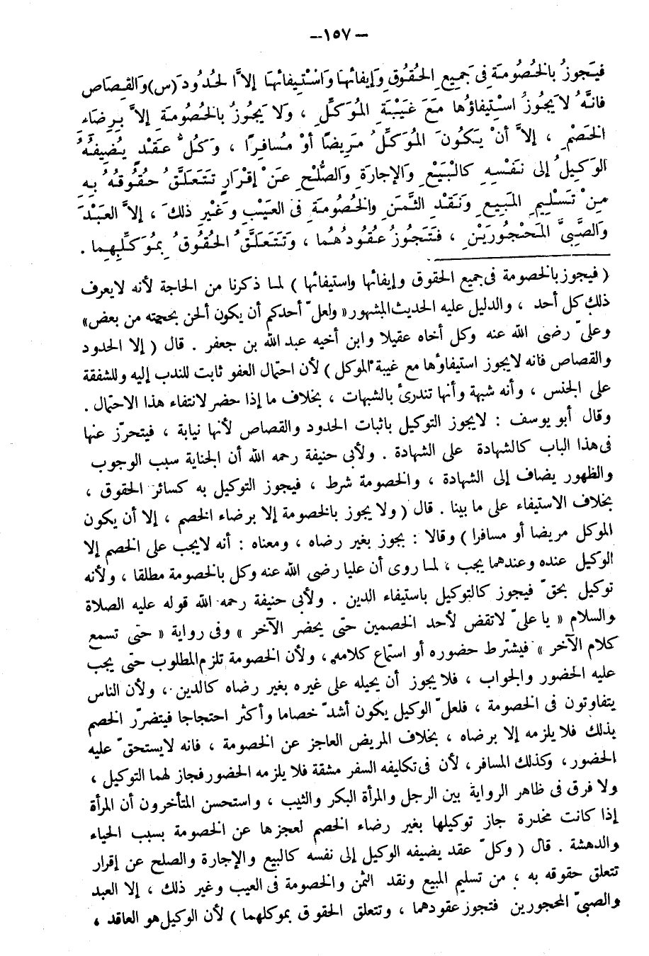 فَيَجُوزُ بِالْخُصُومَةِ فِي جَمِيعِ الْحُقُوقِ وَإِيفَائِهَا وَاسْتِيفَائِهَا إِلَّا الْحُدُودَ (س) وَالْقِصَاصَ فَإِنَّهُ لَا يَجُوزُ اسْتِيفَاؤُهَا مَعَ غَيْبَةِ الْمُوَكِّلِ، وَلَا يَجُوزُ بِالْخُصُومَةِ إِلَّا بِرِضَاءِ الْخَصْمِ، إِلَّا أَنْ يَكُونَ الْمُوَكِّلُ مَرِيضًا أَوْ مُسَافِرًا، وَكُلُّ عَقْدٍ يُضِيفُهُ الْوَكِيلُ إِلَى نَفْسِهِ كَالْبَيْعِ وَالْإِجَارَةِ وَالصُّلْحِ عَنْ إِقْرَارٍ تَتَعَلَّقُ حُقُوقُهُ بِهِ مِنْ تَسْلِيمِ الْمَبِيعِ وَنَقْدِ الثَّمَنِ وَالْخُصُومَةِ فِي الْعَيْبِ وَغَيْرِ ذَلِكَ، إِلَّا الْعَبْدَ وَالصَّبِيَّ الْمَحْجُورَيْنِ، فَتَجُوزُ عُقُودُهُمَا، وَتَتَعَلَّقُ الْحُقُوقُ بِمُوَكِّلِهِمَا