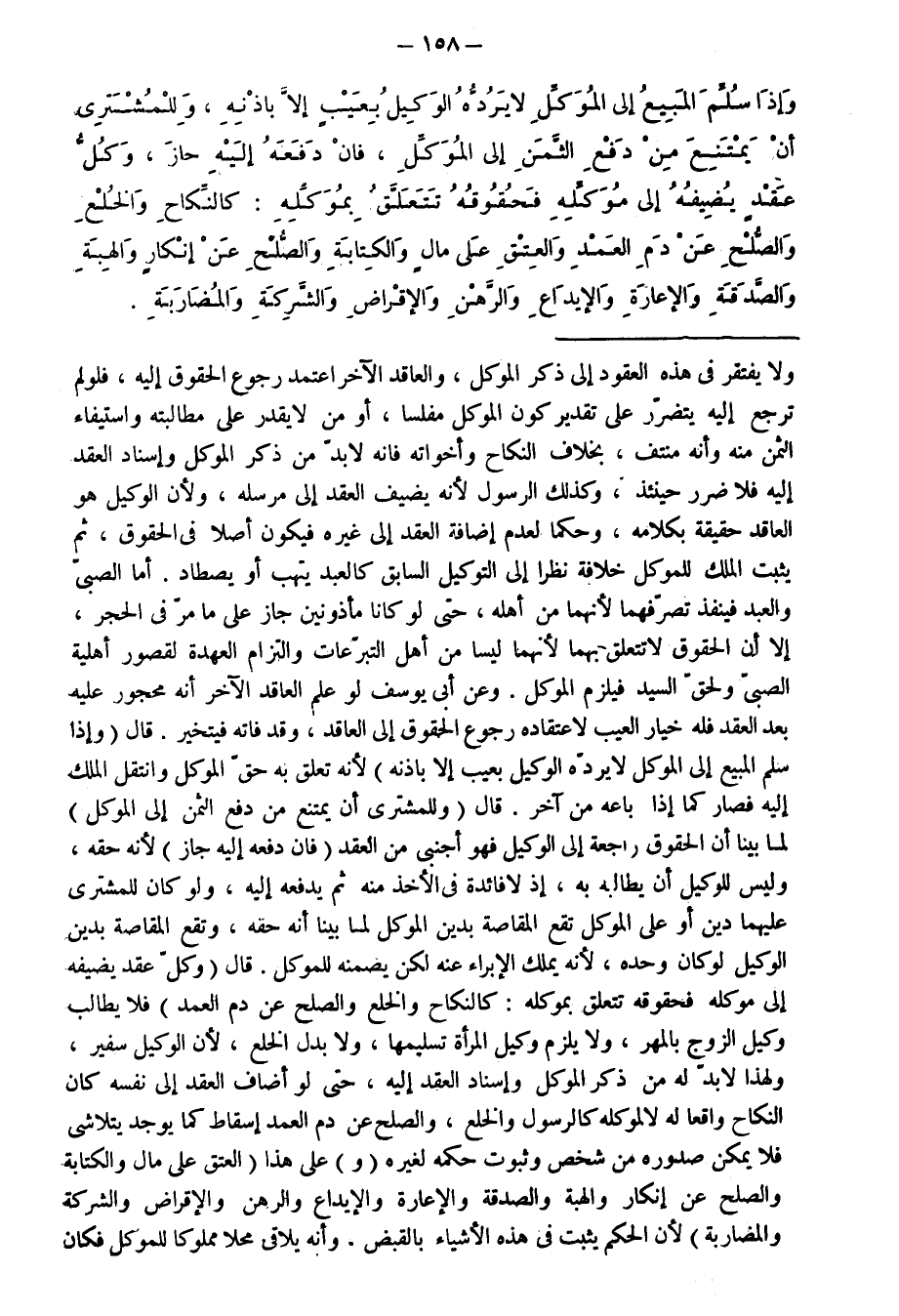 وَإِذَا سُلِّمَ الْمَبِيعُ إِلَى الْمُوَكِّلِ لَا يَرُدُّهُ الْوَكِيلُ بِعَيْبٍ إِلَّا بِإِذْنِهِ، وَلِلْمُشْتَرِي أَنْ يَمْتَنِعَ مِنْ دَفْعِ الثَّمَنِ إِلَى الْمُوَكِّلِ، فَإِنْ دَفَعَهُ إِلَيْهِ جَازَ، وَكُلُّ عَقْدٍ يُضِيفُهُ إِلَى مُوَكِّلِهِ فَحُقُوقُهُ تَتَعَلَّقُ بِمُوَكِّلِهِ: كَالنِّكَاحِ وَالْخُلْعِ وَالصُّلْحِ عَنْ دَمِ الْعَمْدِ وَالْعِتْقِ عَلَى مَالٍ وَالْكِتَابَةِ وَالصُّلْحِ عَنْ إِنْكَارٍ وَالْهِبَةِ وَالصَّدَقَةِ وَالْإِعَارَةِ وَالْإِيدَاعِ وَالرَّهْنِ وَالْإِقْرَاضِ وَالشَّرِكَةِ وَالْمُضَارَبَةِ.