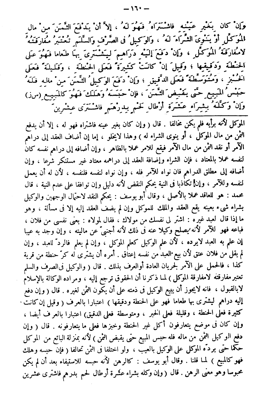وَإِنْ كَانَ بِغَيْرِ عَيْنِهِ فَاشْتَرَاهُ فَهُوَ لَهُ، إِلَّا أَنْ يَدْفَعَ الثَّمَنَ مِنْ مَالِ الْمُوَكِّلِ أَوْ يَنْوِيَ الشِّرَاءَ لَهُ، وَالْوَكِيلُ فِي الصَّرْفِ وَالسَّلَمِ تُعْتَبَرُ مُفَارَقَتُهُ لَا مُفَارَقَةُ الْمُوَكِّلِ، وَإِنْ دَفَعَ إِلَيْهِ دَرَاهِمَ لِيَشْتَرِيَ بِهَا طَعَامًا فَهُوَ عَلَى الْحِنْطَةِ وَدَقِيقِهَا؛ وَقِيلَ إِنْ كَانَتْ كَثِيرَةً فَعَلَى الْحِنْطَةِ، وَقَلِيلَةً فَعَلَى الْخُبْزِ، وَمُتَوَسِّطَةً فَعَلَى الدَّقِيقِ؛ وَإِنْ دَفَعَ الْوَكِيلُ الثَّمَنَ مِنْ مَالِهِ فَلَهُ حَبْسُ الْمَبِيعِ حَتَّى يَقْبِضَ الثَّمَنَ، فَإِنْ حَبَسَهُ وَهَلَكَ فَهُوَ كَالْمَبِيعِ (س ز) وَإِنْ وَكَّلَهُ بِشِرَاءِ عَشَرَةِ أَرْطَالِ لَحْمٍ بِدِرْهَمٍ فَاشْتَرَى عِشْرِينَ