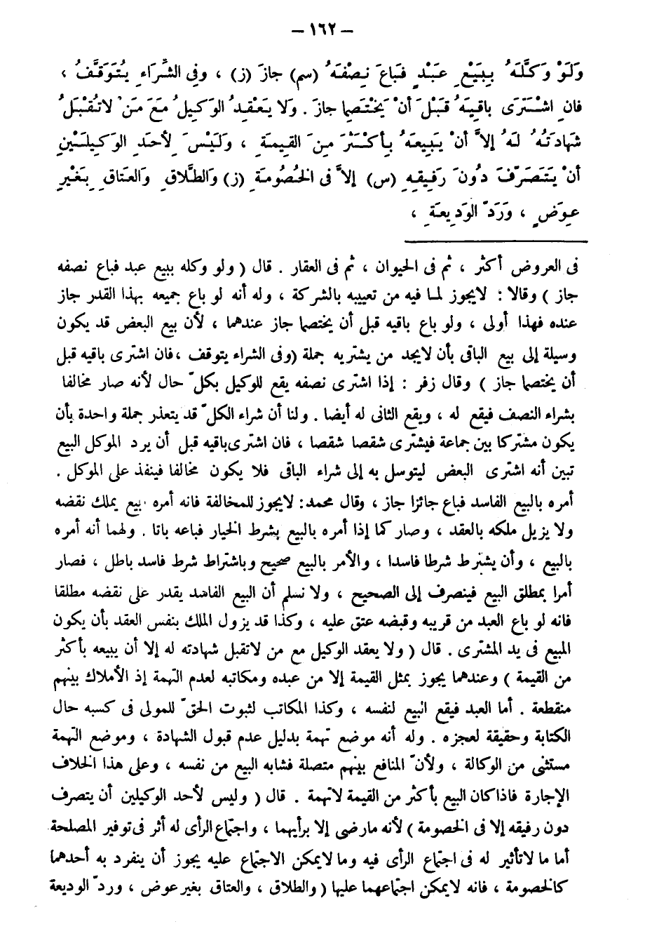 وَلَوْ وَكَّلَهُ بِبَيْعِ عَبْدٍ فَبَاعَ نِصْفَهُ (سم) جَازَ (ز) ، وَفِي الشِّرَاءِ يُتَوَقَّفُ، فَإِنِ اشْتَرَى بَاقِيَهُ قَبْلَ أَنْ يَخْتَصِمَا جَازَ. وَلَا يَعْقِدُ الْوَكِيلُ مَعَ مَنْ لَا تُقْبَلُ شَهَادَتُهُ لَهُ إِلَّا أَنْ يَبِيعَهُ بِأَكْثَرَ مِنَ الْقِيمَةِ، وَلَيْسَ لِأَحَدِ الْوَكِيلَيْنِ أَنْ يَتَصَرَّفَ دُونَ رَفِيقِهِ (س) إِلَّا فِي الْخُصُومَةِ (ز) وَالطَّلَاقِ وَالْعَتَاقِ بِغَيْرِ عِوَضٍ، وَرَدِّ الْوَدِيعَةِ،