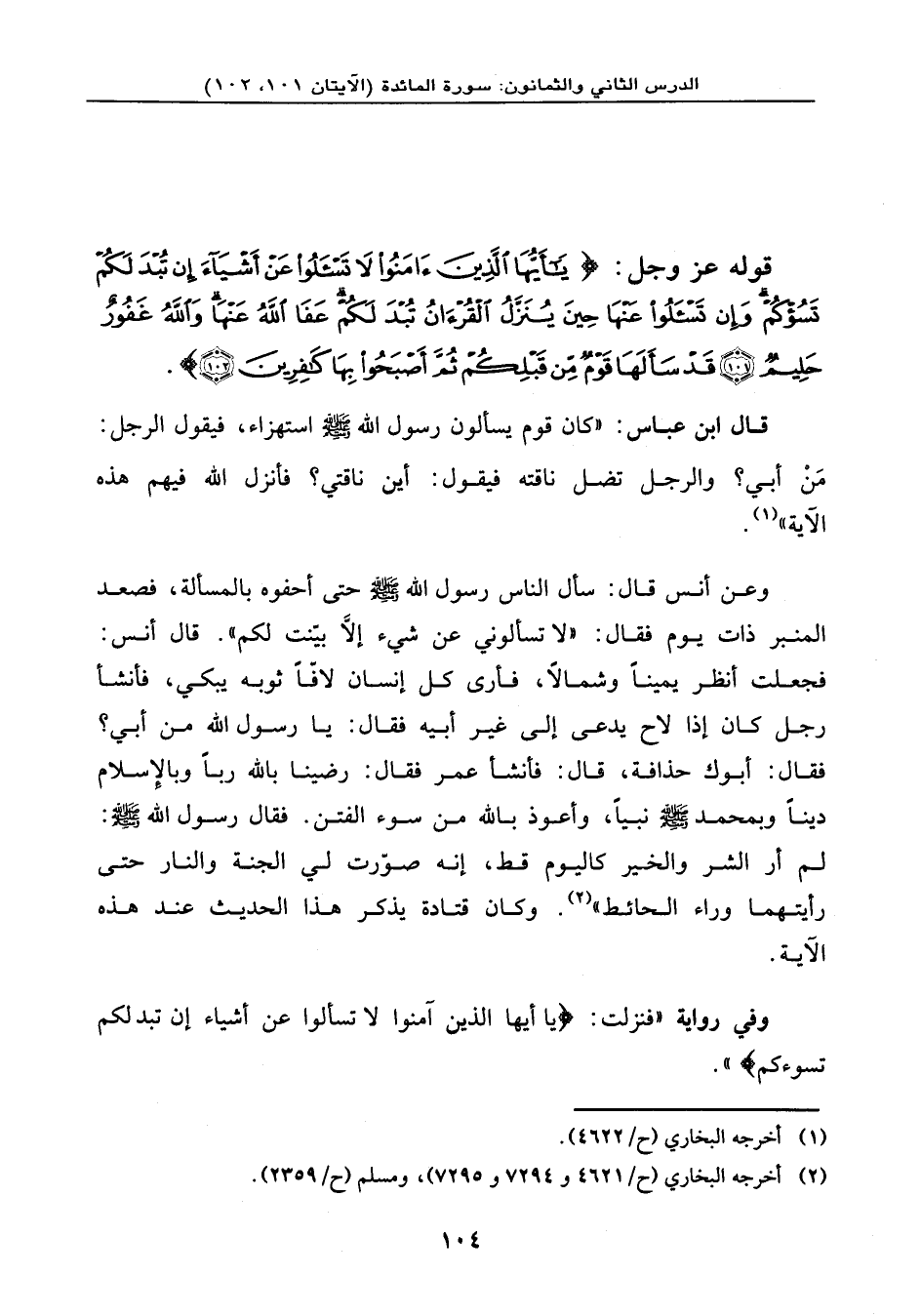 وفي رواية: (فنزلت: {يَا أَيُّهَا الَّذِينَ آمَنُواْ لاَ تَسْأَلُواْ عَنْ أَشْيَاء إِن تُبْدَ لَكُمْ تَسُؤْكُمْ} ) .