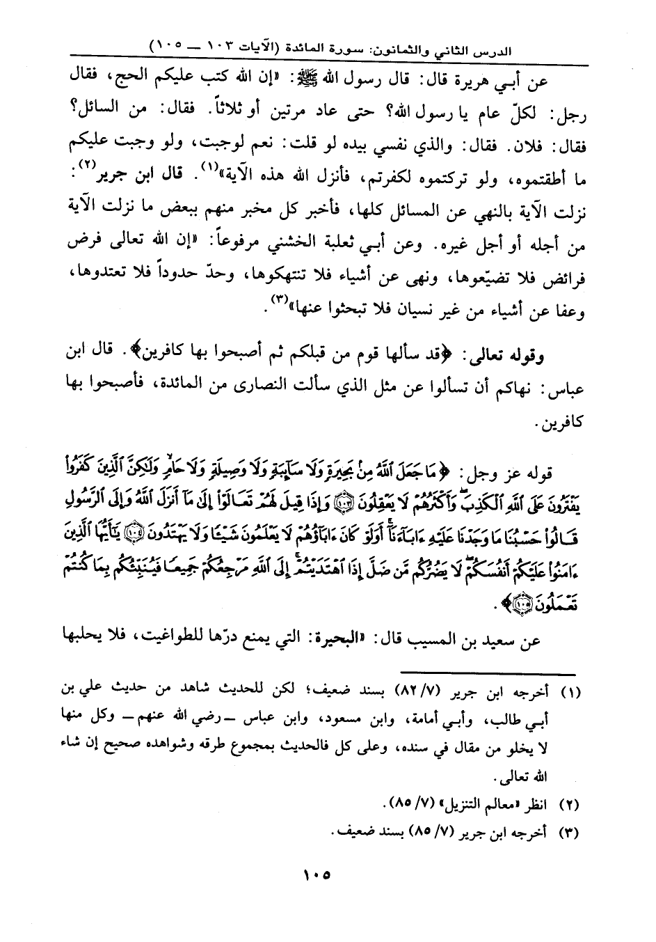 عن أبي هريرة قال: قال رسول الله - صلى الله عليه وسلم -: «إن الله كتب عليكم الحج» ، فقال رجل: لكلّ عام يا رسول الله؟ حتى عاد مرتين أو ثلاثًا. فقال: ... «من السائل» ؟ فقال: فلان. فقال: «والذي نفسي بيدي لو قلت نعم لوجبت، ولو وجبت عليكم ما أطقتموه، ولو تركتموه لكفرتم» ، فأنزل الله هذه الآية. قال ابن جرير: نزلت الآية بالنهي عن المسائل كلها، فأخبر كل مخبر منهم ببعض ما نزلت الآية من أجله أو أجل غيره. وعن أبي ثعلبة الخشني مرفوعًا: «إن الله تعالى فرض فرائض فلا تضيّعوها، ونهى عن أشياء فلا تنتهكوها، وحدّ حدودًا فلا تعتدوها، وعفا عن أشياء من غير نسيان فلا تبحثوا عنها» .