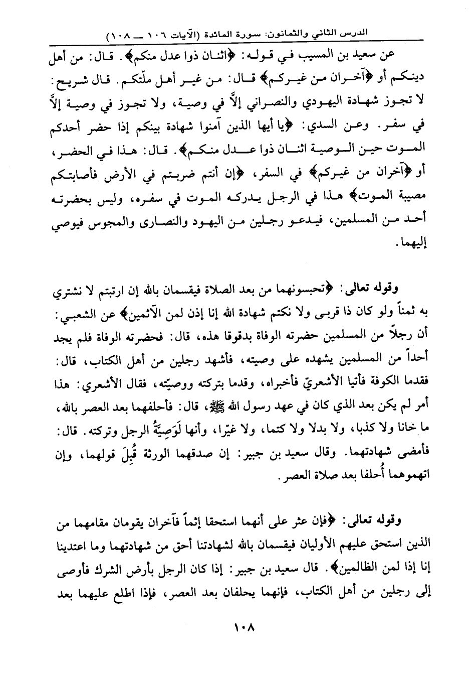 عن سعيد بن المسيب في قوله: {اثْنَانِ ذَوَا عَدْلٍ مِّنكُمْ} . قال: من أهل دينكم أو {آخَرَانِ مِنْ غَيْرِكُمْ} ، قال: من غير أهل ملّتكم. قال شريح: لا تجوز شهادة اليهودي والنصراني إلا في وصية , ولا تجوز في وصية إلا في سفر. وعن السدي: {يِا أَيُّهَا الَّذِينَ آمَنُواْ شَهَادَةُ بَيْنِكُمْ إِذَا حَضَرَ أَحَدَكُمُ الْمَوْتُ حِينَ الْوَصِيَّةِ اثْنَانِ ذَوَا عَدْلٍ مِّنكُمْ} . قال: هذا في الحضر، أو {آخَرَانِ مِنْ غَيْرِكُمْ} في السفر، {إِنْ أَنتُمْ ضَرَبْتُمْ فِي الأَرْضِ فَأَصَابَتْكُم مُّصِيبَةُ الْمَوْتِ} هذا في الرجل يدركه الموت في سفره، وليس بحضرته أحد من المسلمين، فيدعو رجلين من اليهود والنصارى والمجوس فيوصي إليهما.