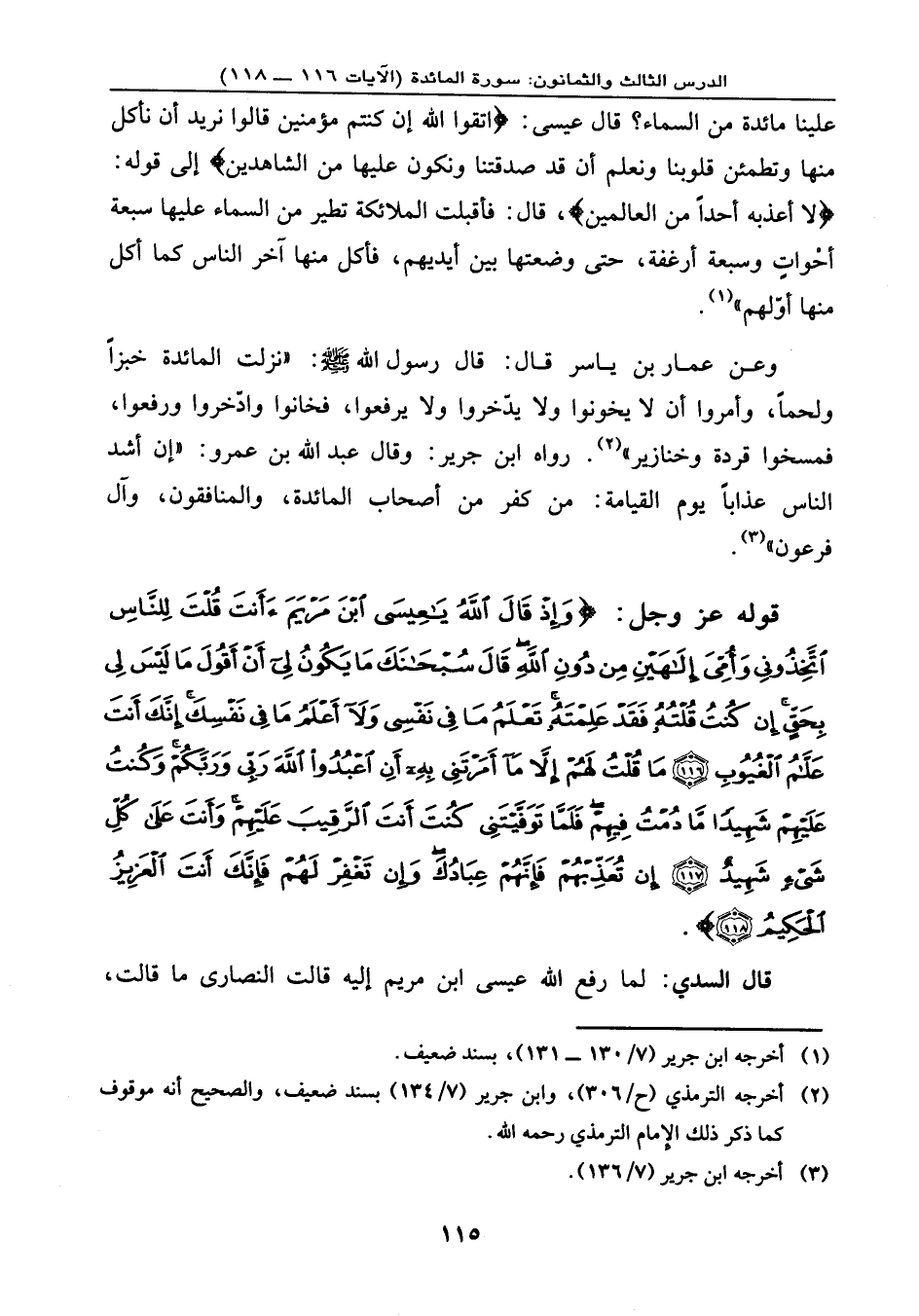 وعن عمار بن ياسر قال: قال رسول الله - صلى الله عليه وسلم -: «نزلت المائدة خبزًا ولحمًا، وأمروا أن لا يخونوا ولا يدّخروا ولا يرفعوا، فخانوا وادّخروا ورفعوا فمسخوا قردة وخنازير» . رواه ابن جرير. وقال عبد الله بن عمرو: (إن أشد الناس عذابًا يوم القيامة من كفر من أصحاب المائدة، والمنافقون، وآل فرعون) .