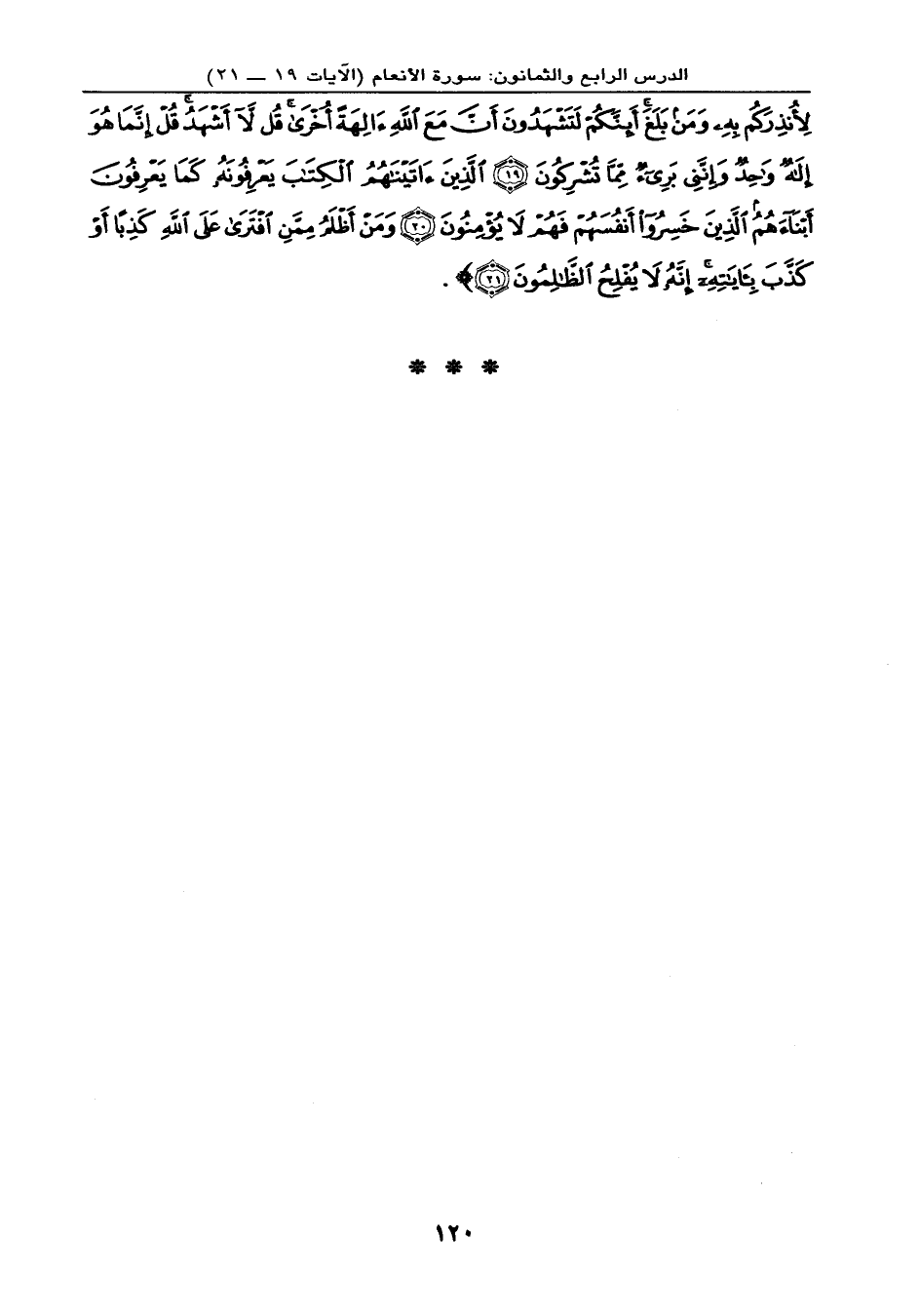 لأُنذِرَكُم بِهِ وَمَن بَلَغَ أَئِنَّكُمْ لَتَشْهَدُونَ أَنَّ مَعَ اللهِ آلِهَةً أُخْرَى قُل لاَّ أَشْهَدُ قُلْ إِنَّمَا هُوَ إِلَهٌ وَاحِدٌ وَإِنَّنِي بَرِيءٌ مِّمَّا تُشْرِكُونَ (19) الَّذِينَ آتَيْنَاهُمُ الْكِتَابَ يَعْرِفُونَهُ كَمَا يَعْرِفُونَ أَبْنَاءهُمُ الَّذِينَ خَسِرُواْ أَنفُسَهُمْ فَهُمْ لاَ يُؤْمِنُونَ (20) وَمَنْ أَظْلَمُ مِمَّنِ افْتَرَى عَلَى اللهِ كَذِباً أَوْ كَذَّبَ بِآيَاتِهِ إِنَّهُ لاَ يُفْلِحُ الظَّالِمُونَ (21) } .