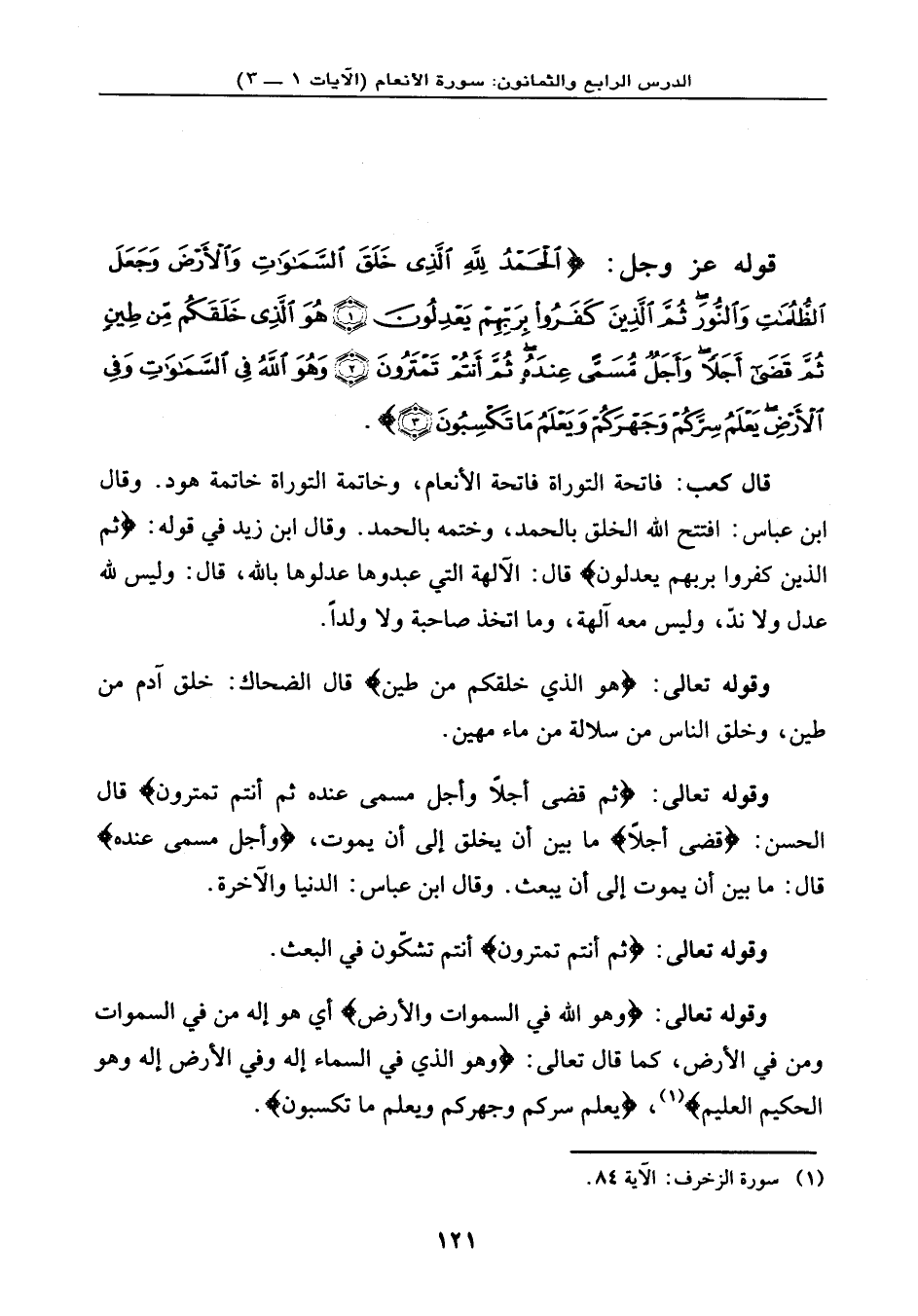 قال كعب: فاتحة التوراة فاتحة الأنعام، وخاتمة التوراة خاتمة هود. وقال ابن عباس: افتتح الله الخلق بالحمد، وختمه بالحمد. وقال ابن زيد في قوله: {ثُمَّ الَّذِينَ كَفَرُواْ بِرَبِّهِم يَعْدِلُونَ} ، قال: الآلهة التي عبدوها عدلوها بالله، قال: وليس لله عدل ولا ندّ، وليس معه آلهة، وما اتخذ صاحبة ولا ولدًا.