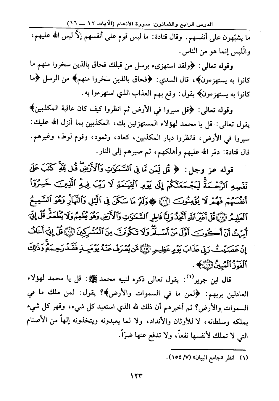 قوله عز وجل: {قُل لِّمَن مَّا فِي السَّمَاوَاتِ وَالأَرْضِ قُل لِلّهِ كَتَبَ عَلَى نَفْسِهِ الرَّحْمَةَ لَيَجْمَعَنَّكُمْ إِلَى يَوْمِ الْقِيَامَةِ لاَ رَيْبَ فِيهِ الَّذِينَ خَسِرُواْ أَنفُسَهُمْ فَهُمْ لاَ يُؤْمِنُونَ (12) وَلَهُ مَا سَكَنَ فِي اللَّيْلِ وَالنَّهَارِ وَهُوَ السَّمِيعُ الْعَلِيمُ (13) قُلْ أَغَيْرَ اللهِ أَتَّخِذُ وَلِيّاً فَاطِرِ السَّمَاوَاتِ وَالأَرْضِ وَهُوَ يُطْعِمُ وَلاَ يُطْعَمُ قُلْ إِنِّيَ أُمِرْتُ أَنْ أَكُونَ أَوَّلَ مَنْ أَسْلَمَ وَلاَ تَكُونَنَّ مِنَ الْمُشْرِكَينَ (14) قُلْ إِنِّيَ أَخَافُ إِنْ عَصَيْتُ رَبِّي عَذَابَ يَوْمٍ عَظِيمٍ (15) مَّن يُصْرَفْ عَنْهُ يَوْمَئِذٍ فَقَدْ رَحِمَهُ وَذَلِكَ الْفَوْزُ الْمُبِينُ (16) } .
