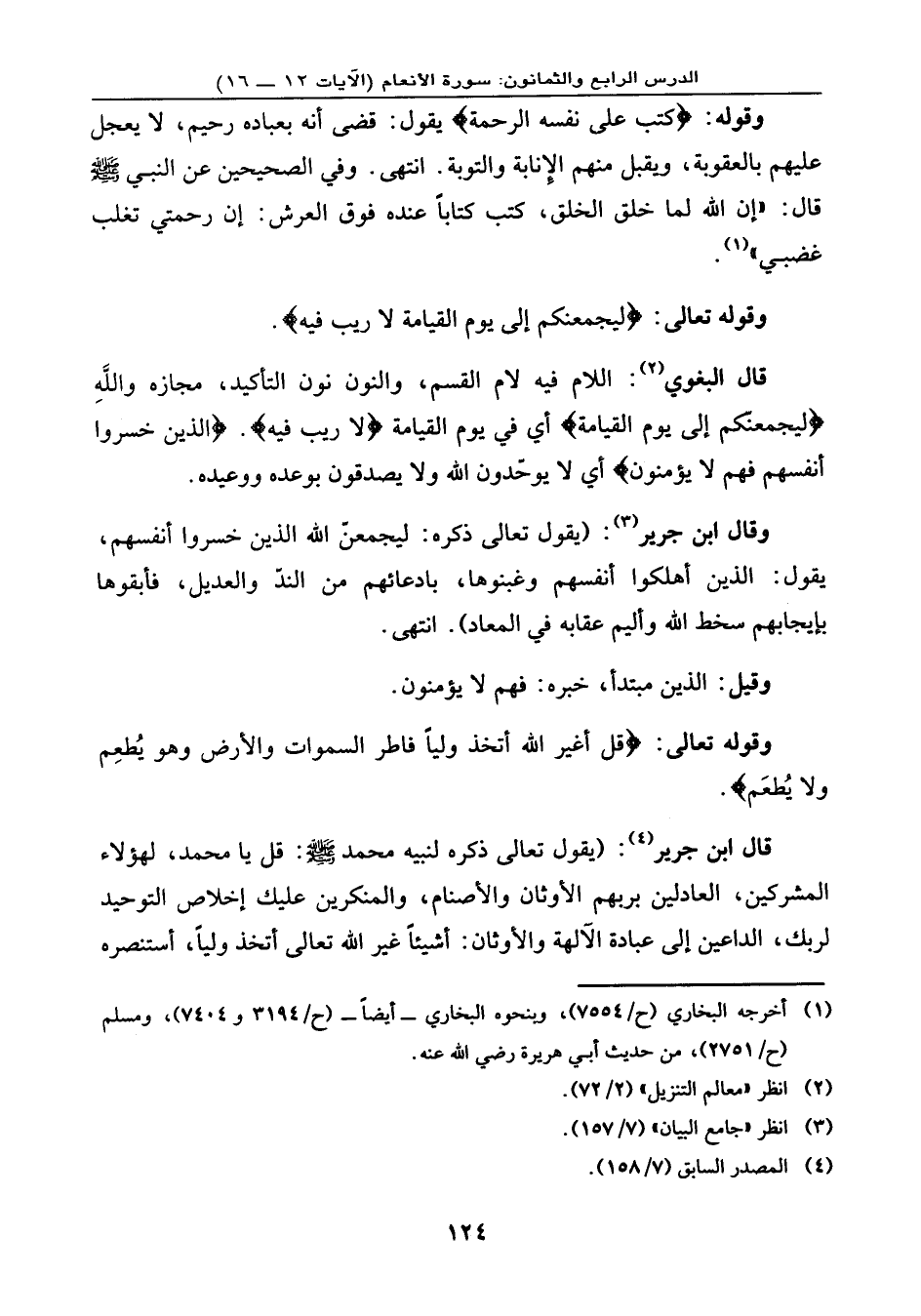 وقوله: {كَتَبَ عَلَى نَفْسِهِ الرَّحْمَةَ} ، يقول: قضى أنه بعباده ... رحيم، لا يعجل عليهم بالعقوبة، ويقبل منهم الإِنابة والتوبة. انتهى. وفي الصحيحين عن النبي - صلى الله عليه وسلم - قال: «إن الله لما خلق الخلق، كتب كتابًا عنده فوق العرش: إن رحمتي تغلب غضبي» .
