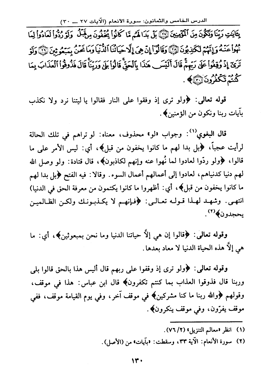 وقوله تعالى: {وَلَوْ تَرَى إِذْ وُقِفُواْ عَلَى رَبِّهِمْ قَالَ أَلَيْسَ هَذَا بِالْحَقِّ قَالُواْ بَلَى وَرَبِّنَا قَالَ فَذُوقُواْ العَذَابَ بِمَا كُنتُمْ تَكْفُرُونَ} ، قال ابن عباس: هذا في موقف، وقولهم: {وَاللهِ رَبِّنَا مَا كُنَّا مُشْرِكِينَ} في موقف آخر، وفي يوم القيامة موقف، ففي موقف يفرّون، وفي موقف ينكرون.