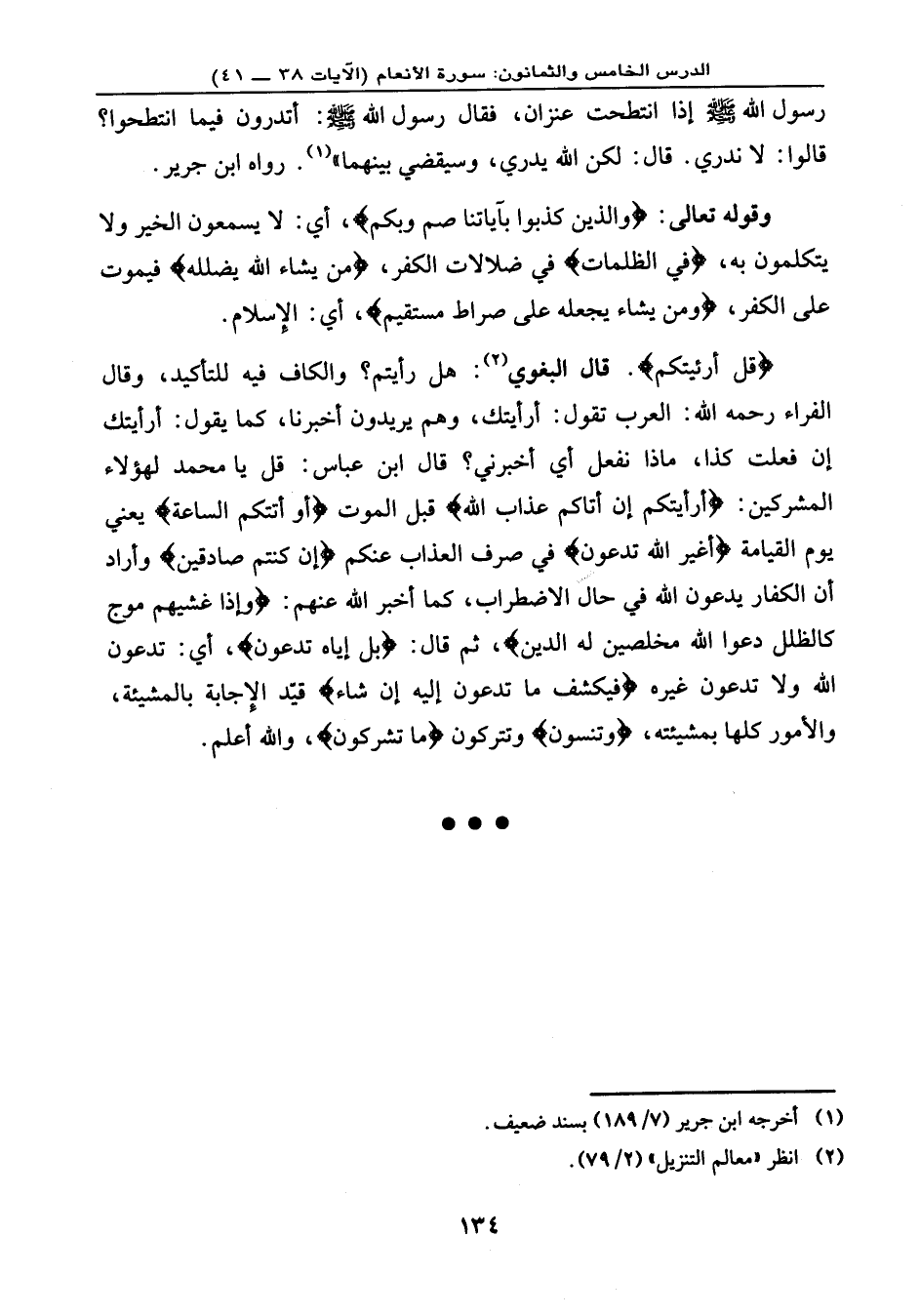 {قُلْ أَرَأَيْتُكُم} . قال البغوي: هل رأيتم؟ والكاف فيه للتأكيد، وقال الفراء رحمه الله: العرب تقول: أرأيتك، وهم يريدون أخبرنا، كما يقول: أرأيتك إن فعلت كذا، ماذا نفعل أي أخبرني؟ قال ابن عباس: قل يا محمد لهؤلاء المشركين: {أَرَأَيْتُكُم إِنْ أَتَاكُمْ عَذَابُ اللهِ} قبل الموت، {أَوْ أَتَتْكُمُ السَّاعَةُ} ، يعني: يوم القيامة، {أَغَيْرَ اللهِ تَدْعُونَ} في صرف العذاب عنكم، {إِن كُنتُمْ صَادِقِينَ} وأراد أن الكفار يدعون الله في حال الاضطراب، كما أخبر الله عنهم: {وَإِذَا غَشِيَهُم مَّوْجٌ كَالظُّلَلِ دَعَوُا اللَّهَ مُخْلِصِينَ لَهُ الدِّينَ} ، ثم قال: {بَلْ إِيَّاهُ تَدْعُونَ} ، أي: تدعون الله ولا تدعون غيره، {فَيَكْشِفُ مَا تَدْعُونَ إِلَيْهِ إِنْ شَاء} قيّد الإِجابة بالمشيئة، والأمور كلها بمشيئته، {وَتَنسَوْنَ} وتتركون، {مَا تُشْرِكُونَ} . والله أعلم.