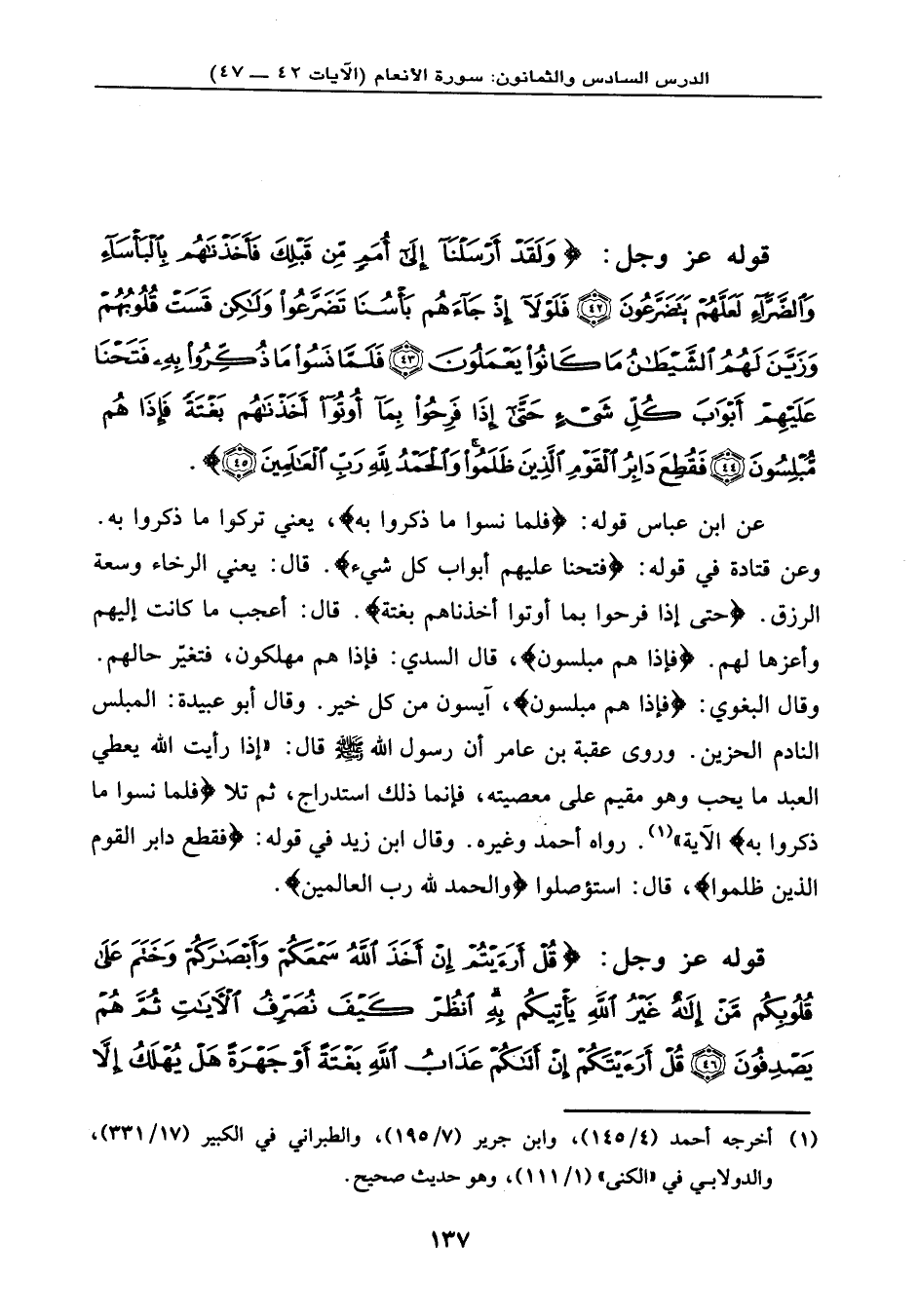 عن ابن عباس: قوله: {فَلَمَّا نَسُواْ مَا ذُكِّرُواْ بِهِ} ، يعني: تركوا ما ذكروا به. وعن قتادة في قوله: {فَتَحْنَا عَلَيْهِمْ أَبْوَابَ كُلِّ شَيْءٍ} . قال: يعني: الرخاء، وسعة الرزق. {حَتَّى إِذَا فَرِحُواْ بِمَا أُوتُواْ أَخَذْنَاهُم بَغْتَةً} . قال: أعجب ما كانت إليهم وأعزها لهم. {فَإِذَا هُم مُّبْلِسُونَ} ، قال السدي: فإذا هم مهلكون، فتغيّر حالهم. وقال البغوي: {فَإِذَا هُم مُّبْلِسُونَ} ، آيسون من كل خير. وقال أبو عبيدة: المبلس النادم الحزين. وروى عقبة بن عامر أن رسول الله - صلى الله عليه وسلم - قال: «إذا رأيت الله يعطي العبد ما يحب وهو مقيم على معصيته، فإنما ذلك استدراج ثم تلا {فَلَمَّا نَسُواْ مَا ذُكِّرُواْ بِهِ} » الآية. رواه أحمد وغيره. وقال ابن زيد في قوله: {فَقُطِعَ دَابِرُ الْقَوْمِ الَّذِينَ ظَلَمُواْ} قال: استؤصلوا. {وَالْحَمْدُ لِلّهِ رَبِّ ... الْعَالَمِينَ} .