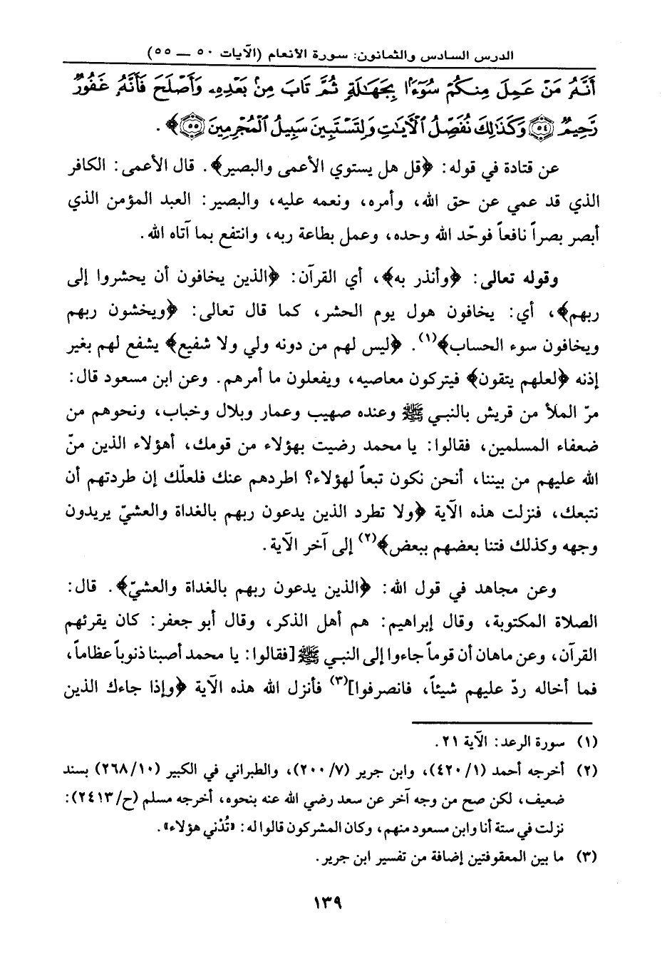 وعن مجاهد في قول الله: {الَّذِينَ يَدْعُونَ رَبَّهُم بِالْغَدَاةِ وَالْعَشِيِّ} . قال: الصلاة المكتوبة. وقال إبراهيم: هم أهل الذكر. وقال أبو جعفر: كان يقرئهم القرآن. وعن ماهان: أن قومًا جاءوا إلى النبي - صلى الله عليه وسلم -[فقالوا: يا محمد أصبنا ذنوبًا عظامًا، فما أخاله ردَّ عليهم شيئًا، فانصرفوا] ، فأنزل الله هذه الآية: {وَإِذَا جَاءكَ الَّذِينَ
