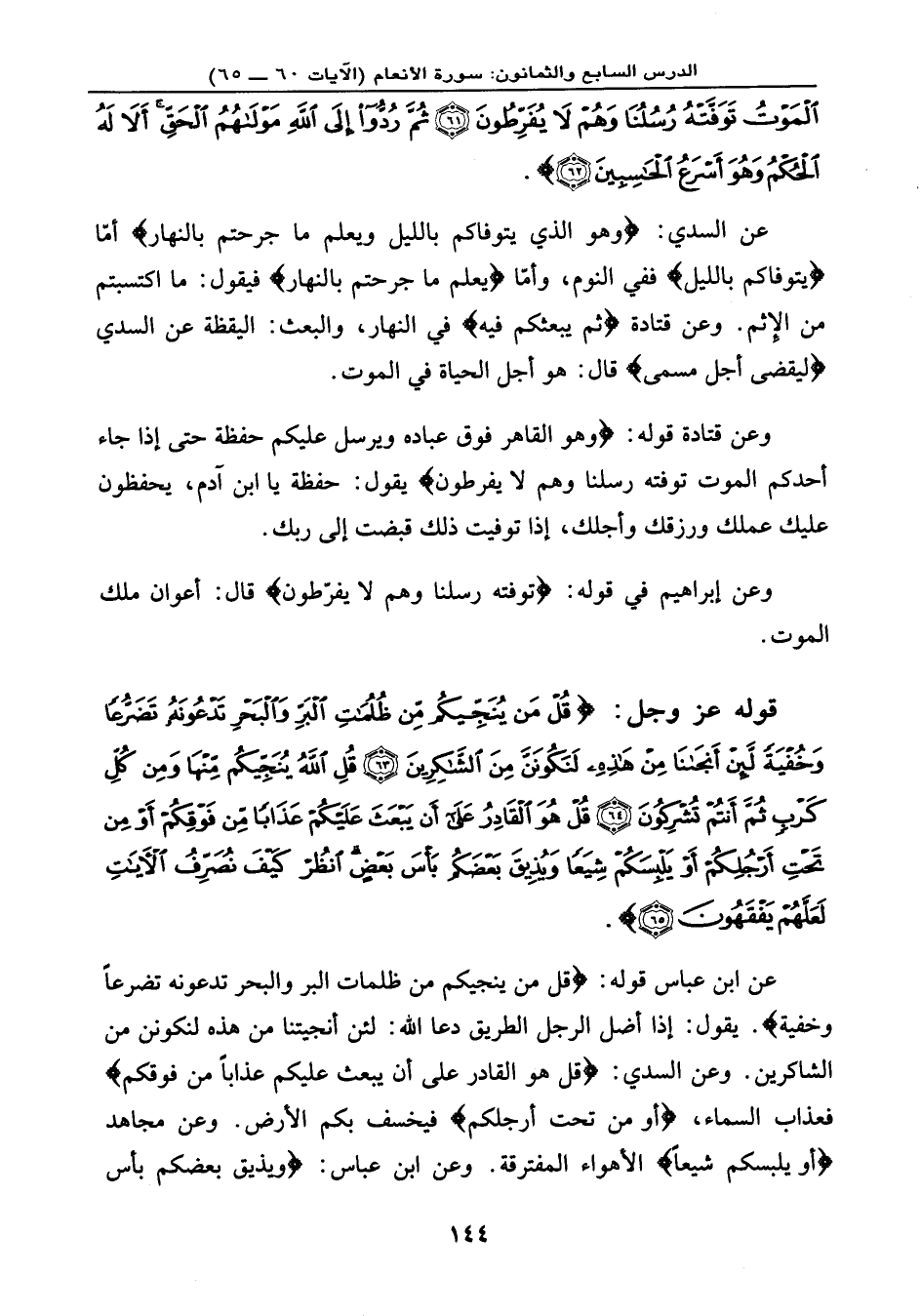 عن السدي: {وَهُوَ الَّذِي يَتَوَفَّاكُم بِاللَّيْلِ وَيَعْلَمُ مَا جَرَحْتُم بِالنَّهَارِ} ، أمّا يتوفاكم بالليل ففي النوم، وأمّا: يعلم ما جرحتم بالنهار، فيقول: ما اكتسبتم من الإِثم. وعن قتادة: {ثُمَّ يَبْعَثُكُمْ فِيهِ} في النهار، والبعث: اليقظة عن السدي {لِيُقْضَى أَجَلٌ مُّسَمًّى} ، قال: هو أجل الحياة في الموت.