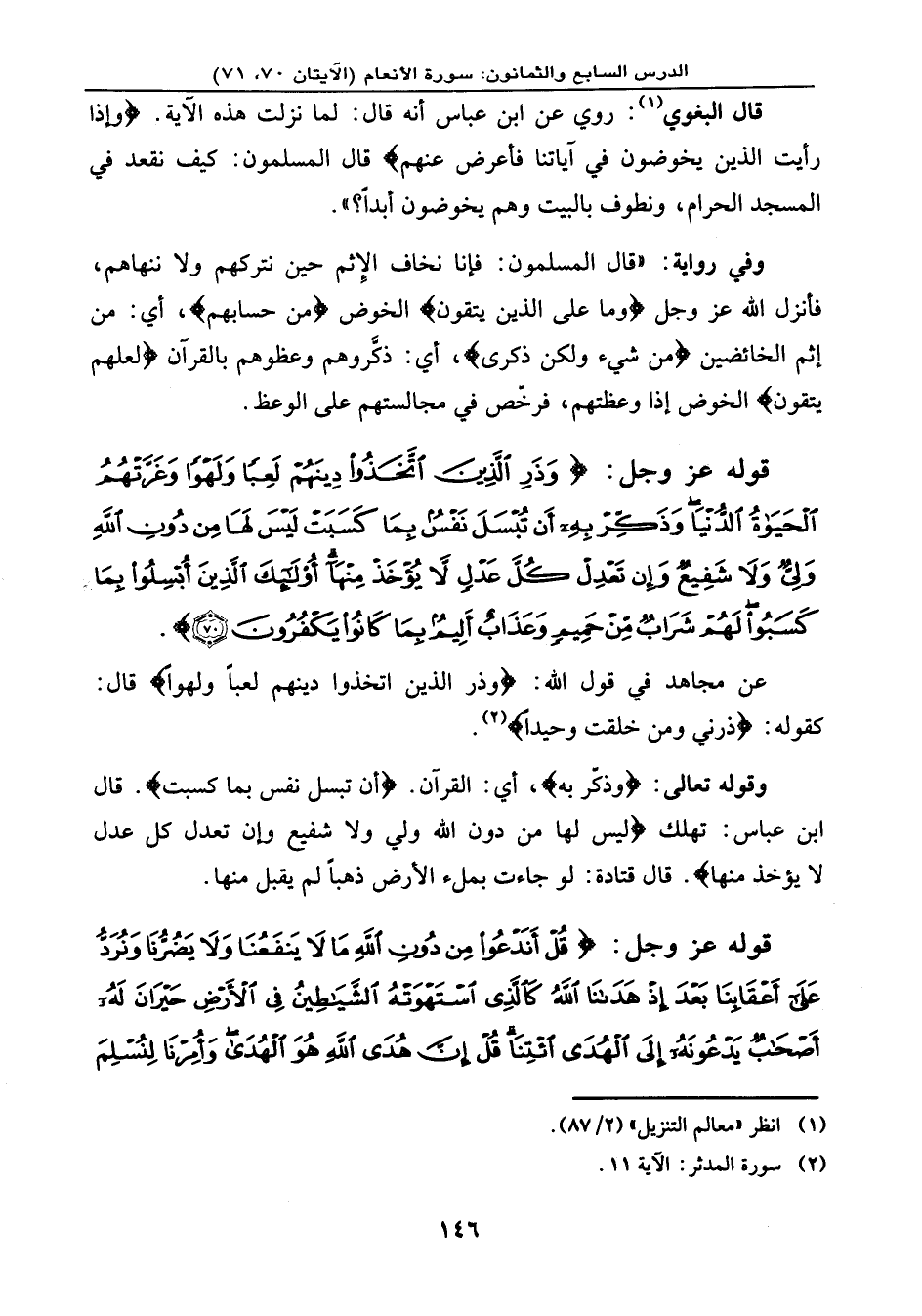 قوله عز وجل: {وَذَرِ الَّذِينَ اتَّخَذُواْ دِينَهُمْ لَعِباً وَلَهْواً وَغَرَّتْهُمُ الْحَيَاةُ الدُّنْيَا وَذَكِّرْ بِهِ أَن تُبْسَلَ نَفْسٌ بِمَا كَسَبَتْ لَيْسَ لَهَا مِن دُونِ اللهِ وَلِيٌّ وَلاَ شَفِيعٌ وَإِن تَعْدِلْ كُلَّ عَدْلٍ لاَّ يُؤْخَذْ مِنْهَا أُوْلَئِكَ الَّذِينَ أُبْسِلُواْ بِمَا كَسَبُواْ لَهُمْ شَرَابٌ مِّنْ حَمِيمٍ وَعَذَابٌ أَلِيمٌ بِمَا كَانُواْ يَكْفُرُونَ (70) } .